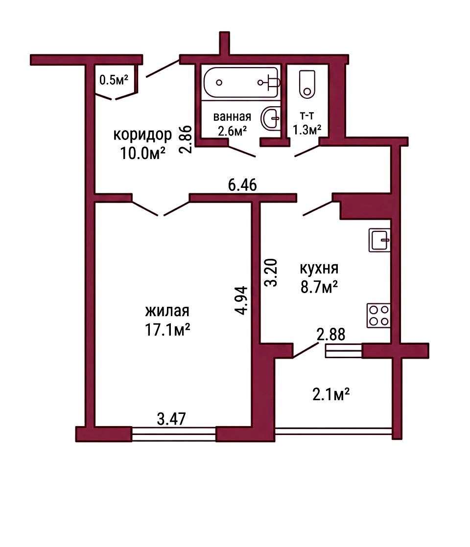 Общая площадь квартиры по СНБ – 42,3 кв.м., общая площадь – 40,2 кв.м., жилая площадь – 17,1 кв.м., кухня – 8,7 кв.м.