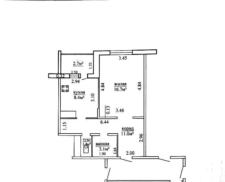 Параметры квартиры: общая площадь- 43,3 кв м по СНБ , жилая площадь- 16,7 кв м, кухня-8,4 кв м.