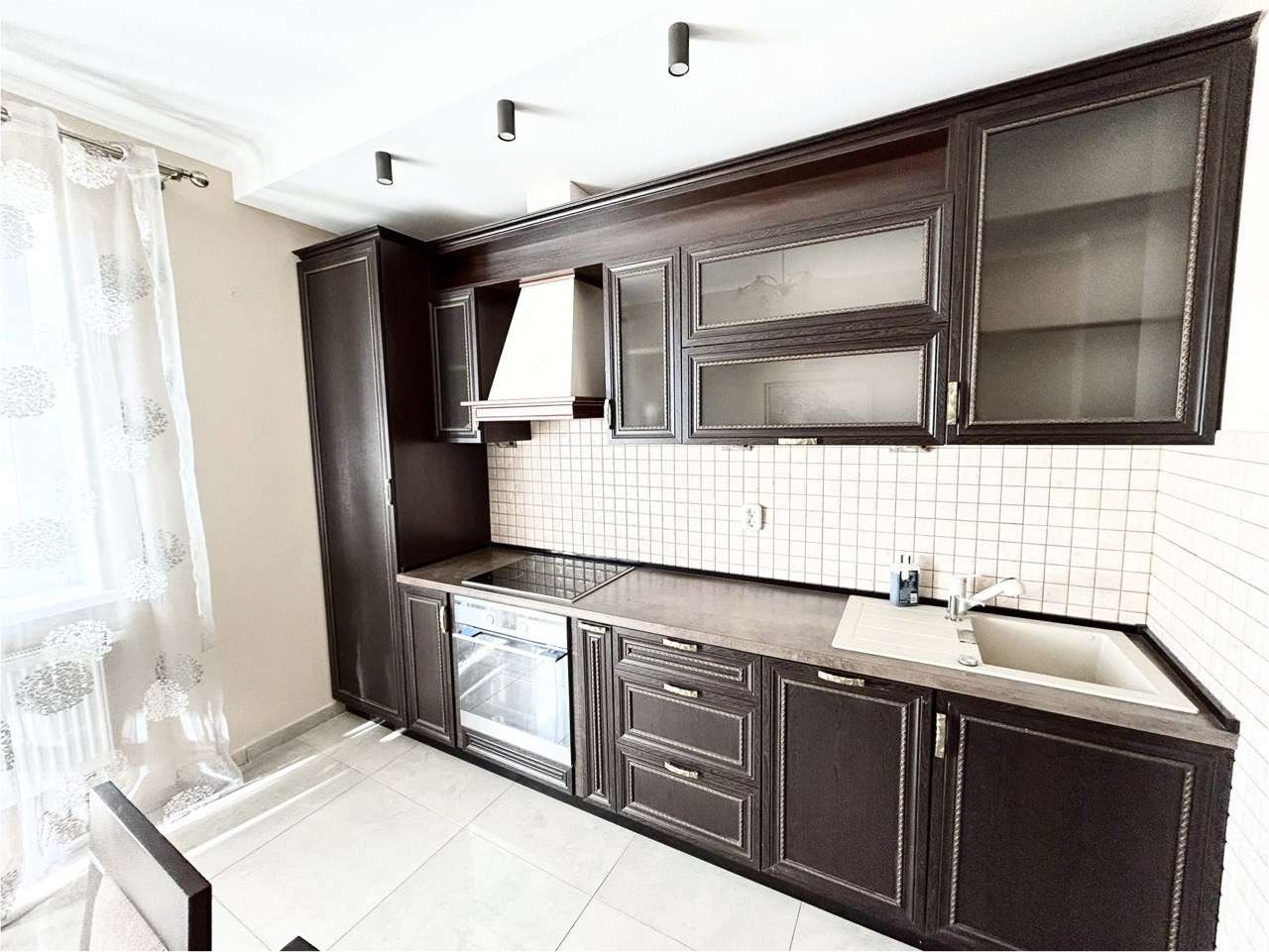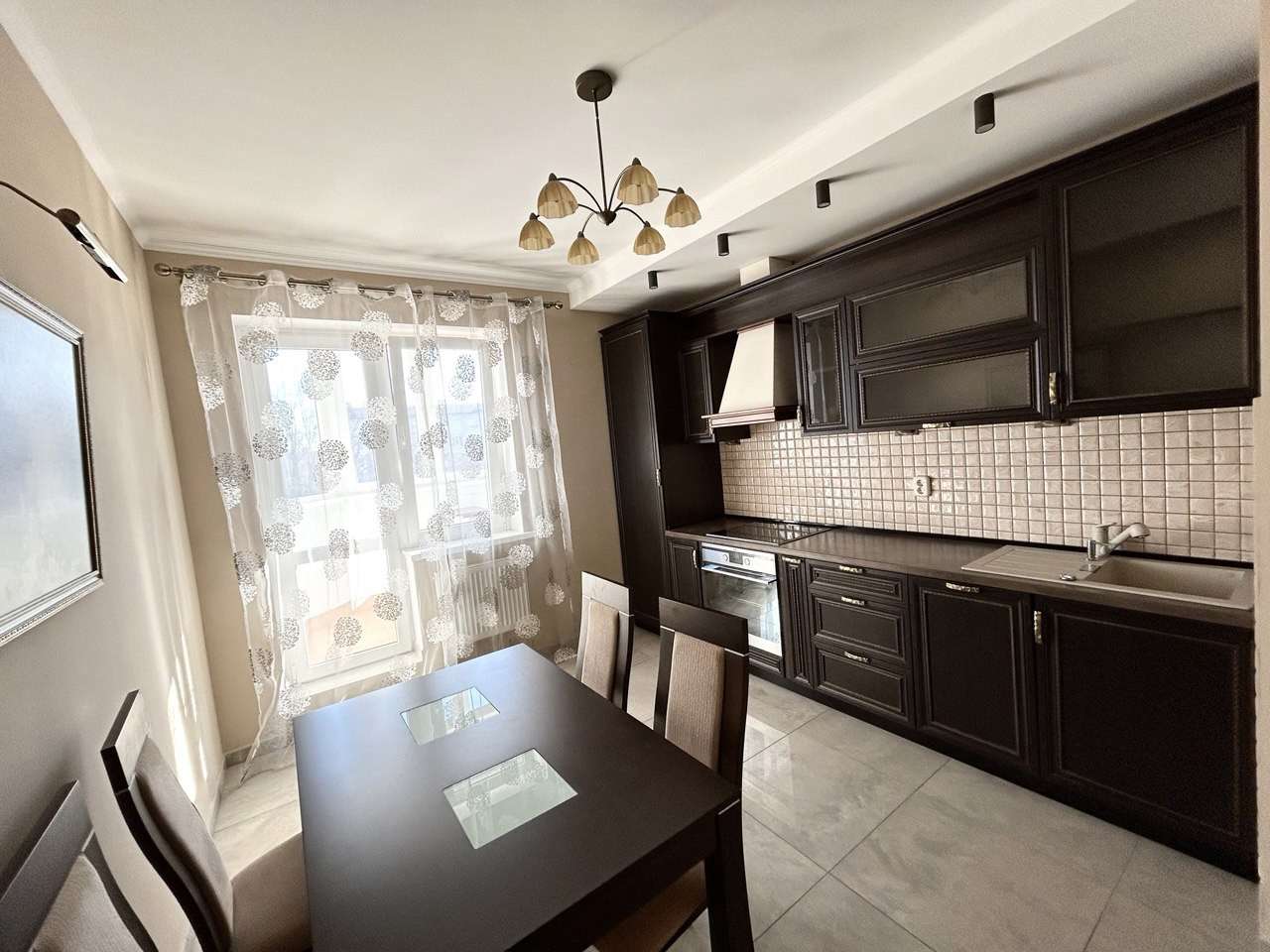 Просторная кухня оборудована кухонным гарнитуром из массива, обеденным столом со стульями, электрической варочной панелью Whirlpool, духовым шкафом Amica, посудомоечной машиной Ariston и вытяжкой.