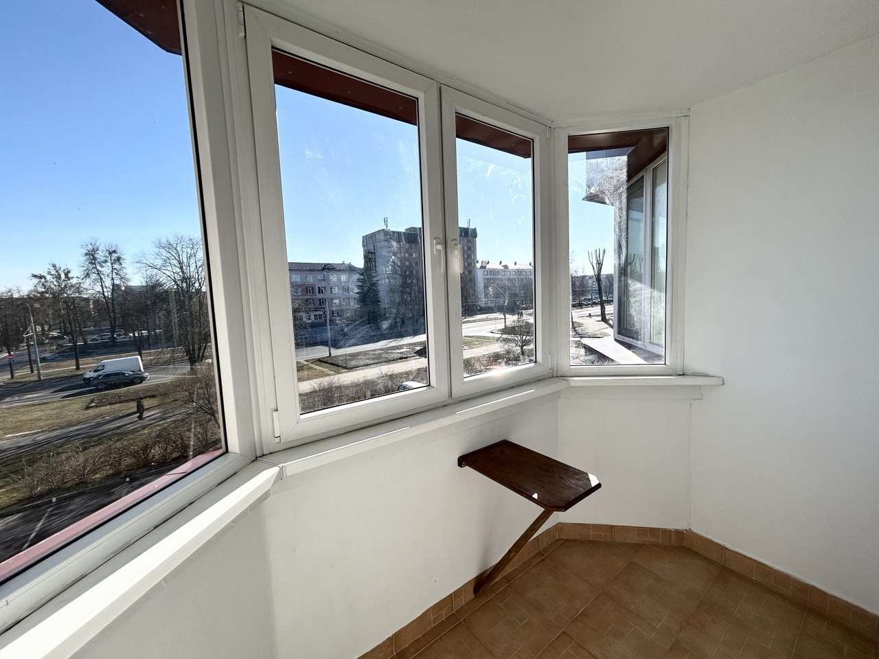 Лоджия остеклена рамой ПВХ, на полу уложена плитка, стены окрашены.