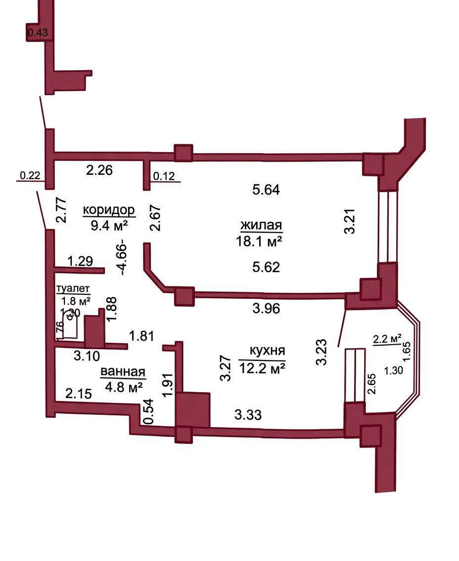 Общая площадь квартиры по СНБ – 48,5 кв.м., общая площадь – 46,3 кв.м., жилая площадь – 18,1 кв.м., кухня – 12,2 кв.м. Высота потолка 2,75 м.