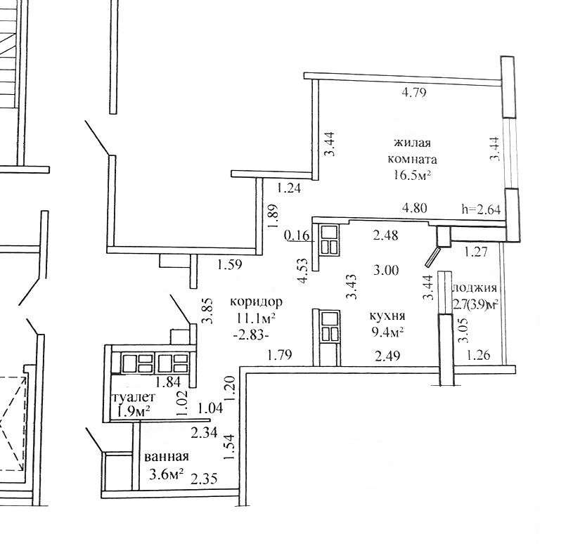 Параметры квартиры: общая площадь- 45,8 кв м, жилая площадь- 16,5 кв м, кухня- 9,4 кв м.