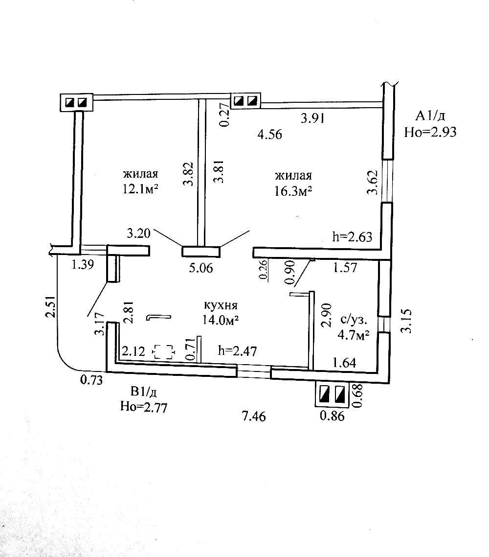 Функциональная планировка квартиры: общая площадь - 47.1 метров квадратных, жилая - 28.4 метров квадратных, кухня - 14.0 метров квадратных. Металлическая входная дверь. Кровля покрыта шифером с организованным наружным водостоком.