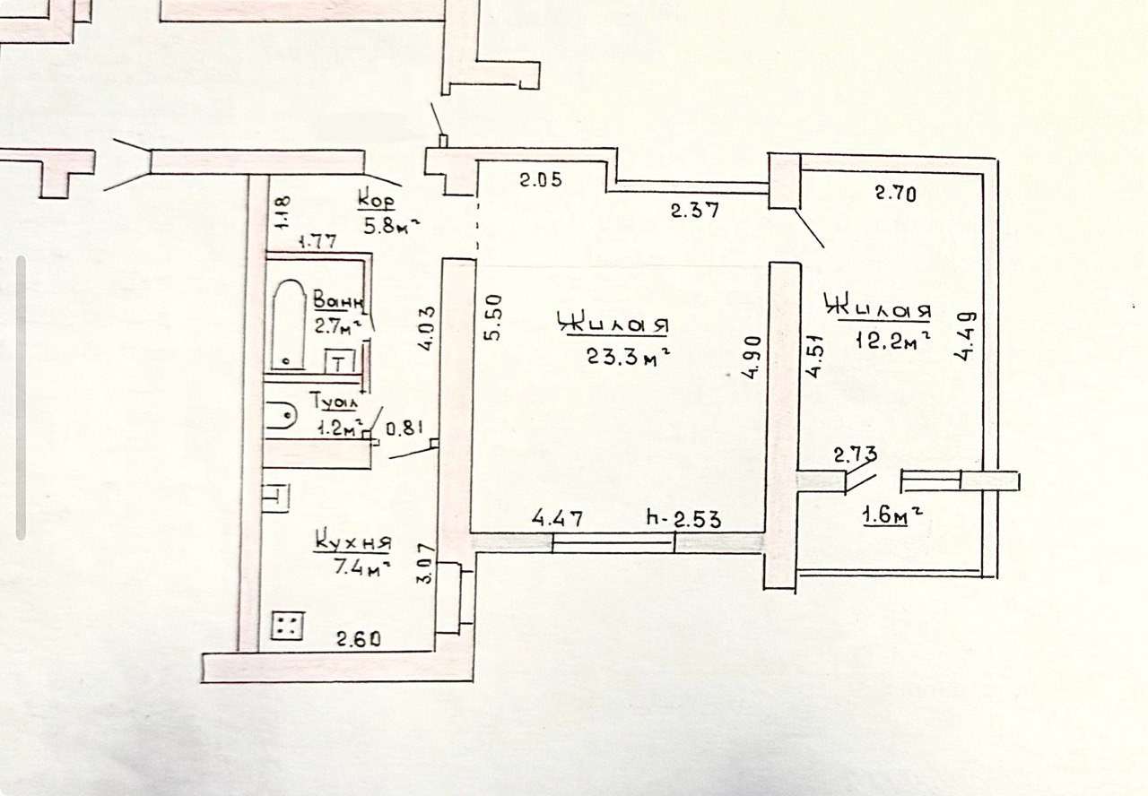 Общая площадь по снб 52,6/жилая 35,5/кухня 7,4 м/кв, высота потолка 2,53 м.