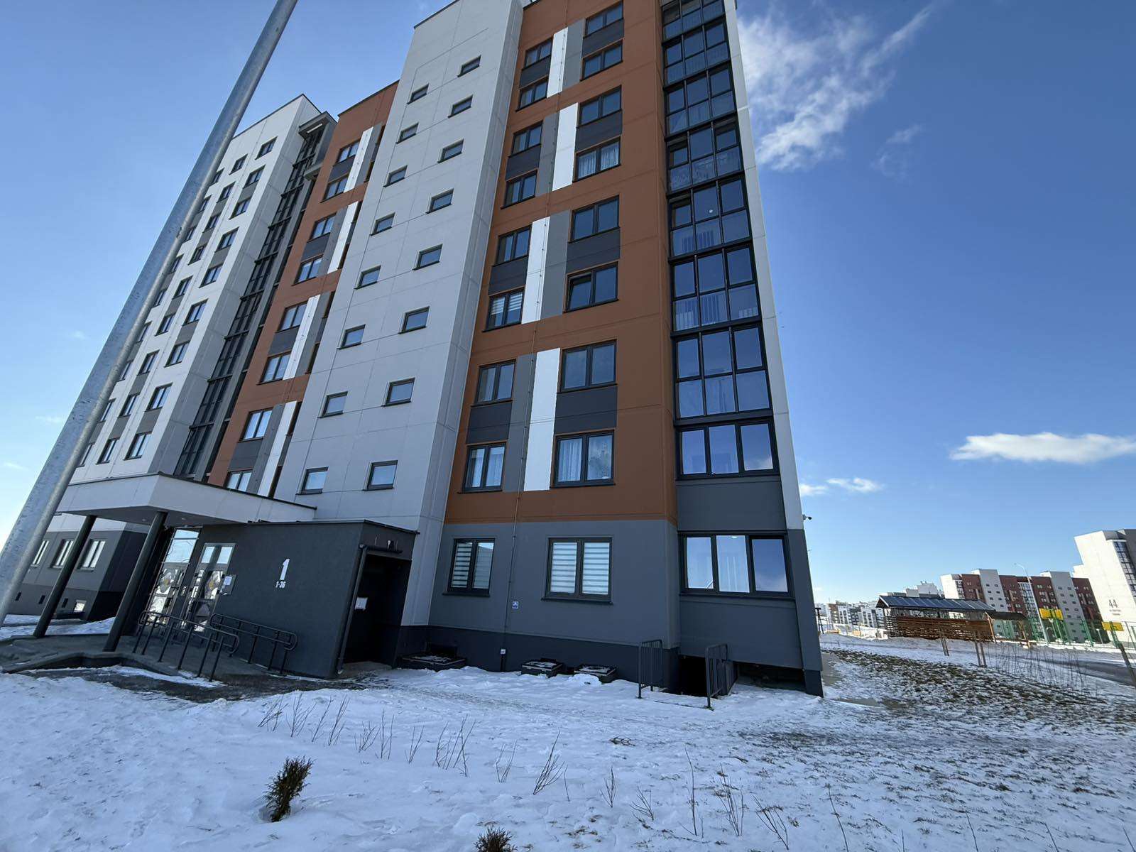 2‑комнатная квартира без отделки в новом доме 2025 года постройки по адресу: г. Гродно, ул. Ольги Санфировой, д. 3, микрорайон Грандичи. Общая площадь – 55,9 м², жилая – 28 м², кухня – 8,9 м². Квартира расположена на 9 этаже 11‑этажного панельного дома с электроплитами, окна выходят во двор.
