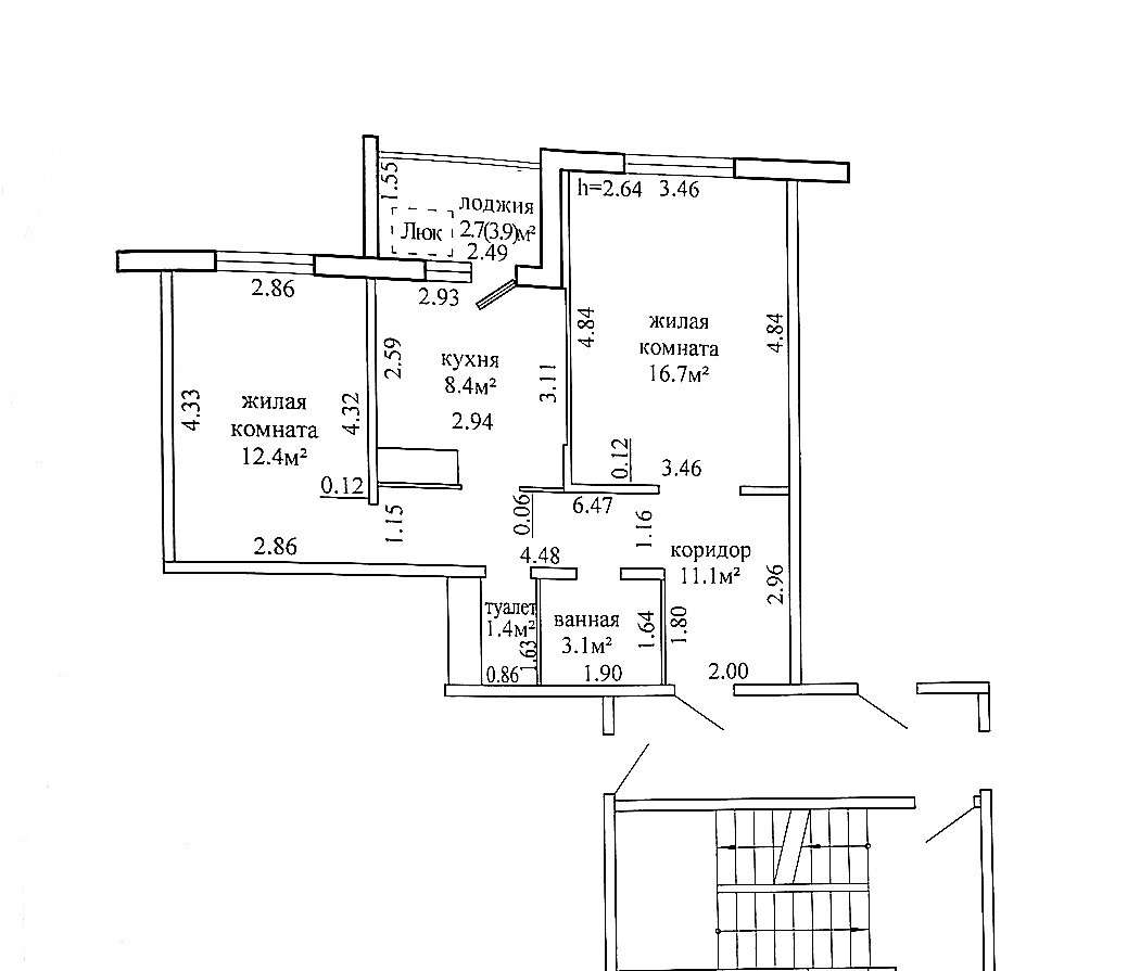 Площадь общая 53.1 м.кв., жилая 29,1 м.кв. (комнаты -12,4м.кв. и 16,7м.кв.), кухня 8.4м.кв., коридор 11,1м.кв., раздельный санузел (1,4м.кв., 3,1м.кв.), просторная лоджия.