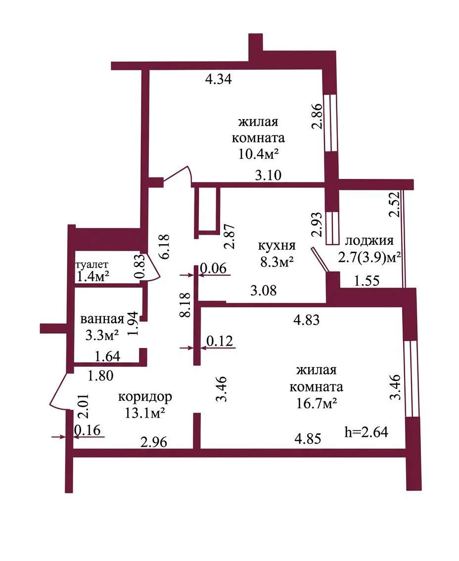 Общая площадь – 56 кв. м., жилая – 21 кв. м., кухня – 8,3 кв. м.