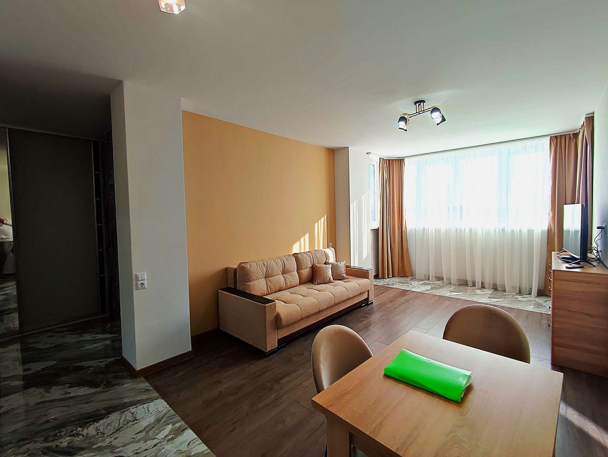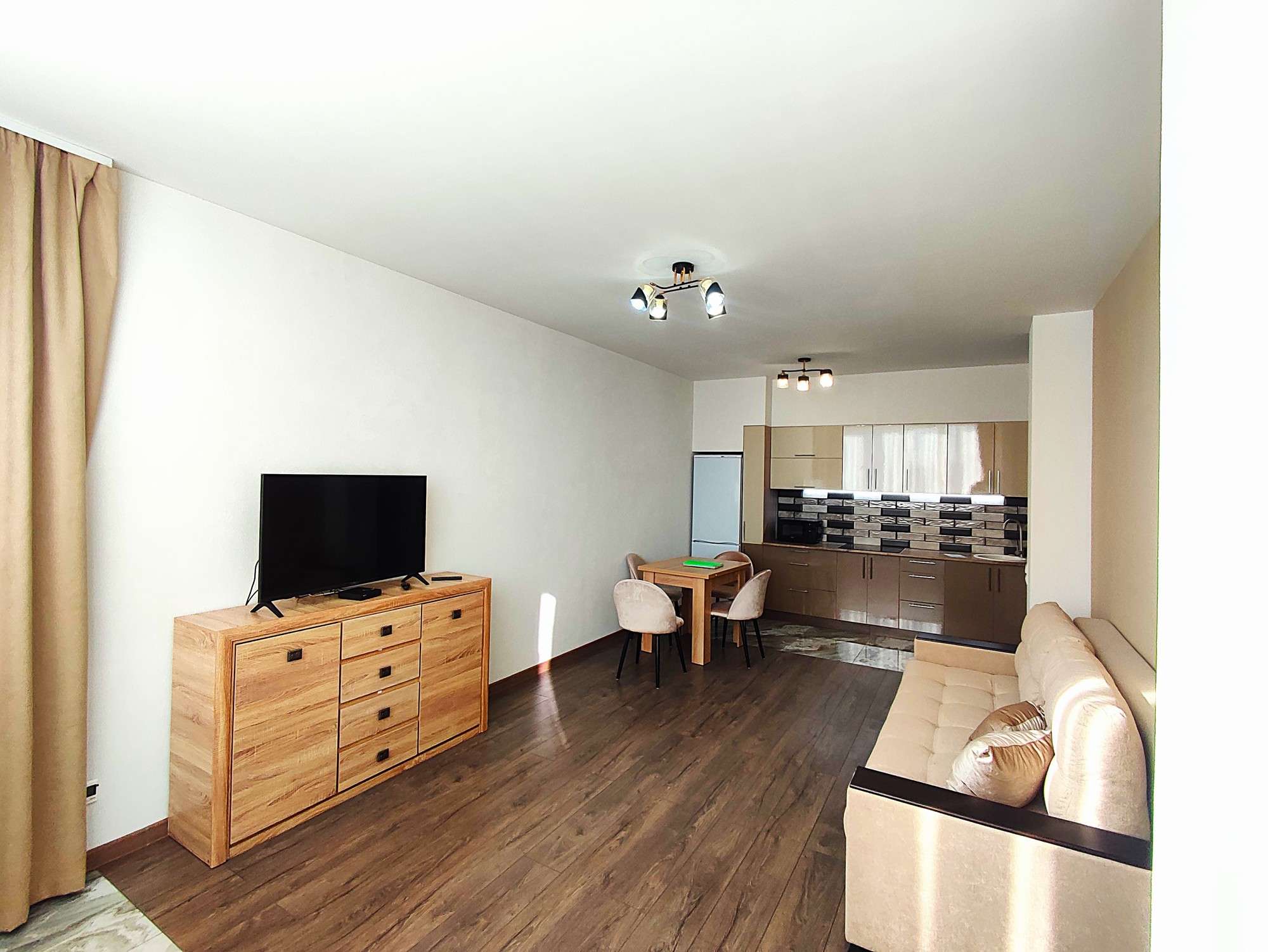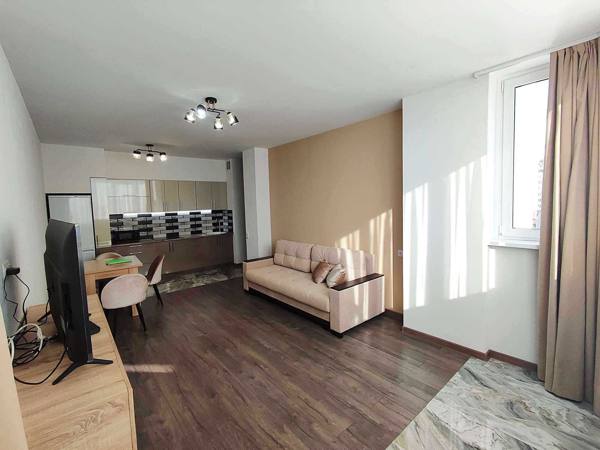 Большая гостиная студия объединенная с кухней и лоджией 24,5 м2 Для вашего комфорта кухня с новым функциональным кухонным гарнитуром и полным комплектом встроенной техники – индукционная варочная панель, духовой шкаф и холодильник, обеденный стол массив и стулья, микроволновая печь, диван, комод, телевизор, шторы. Спальня - шторы.