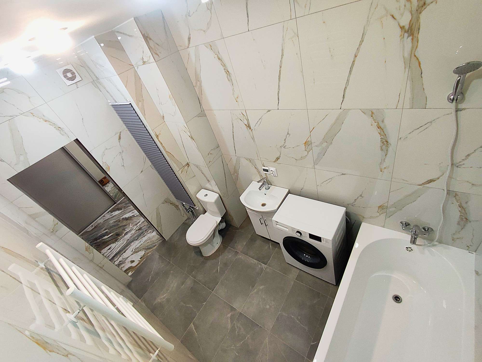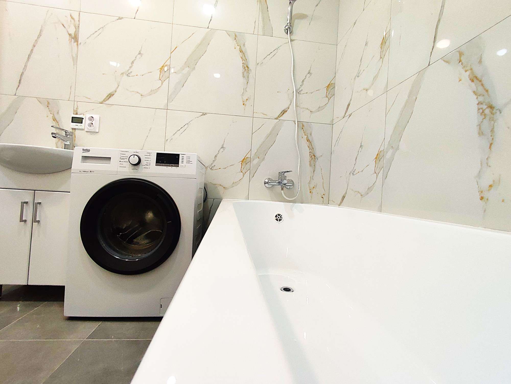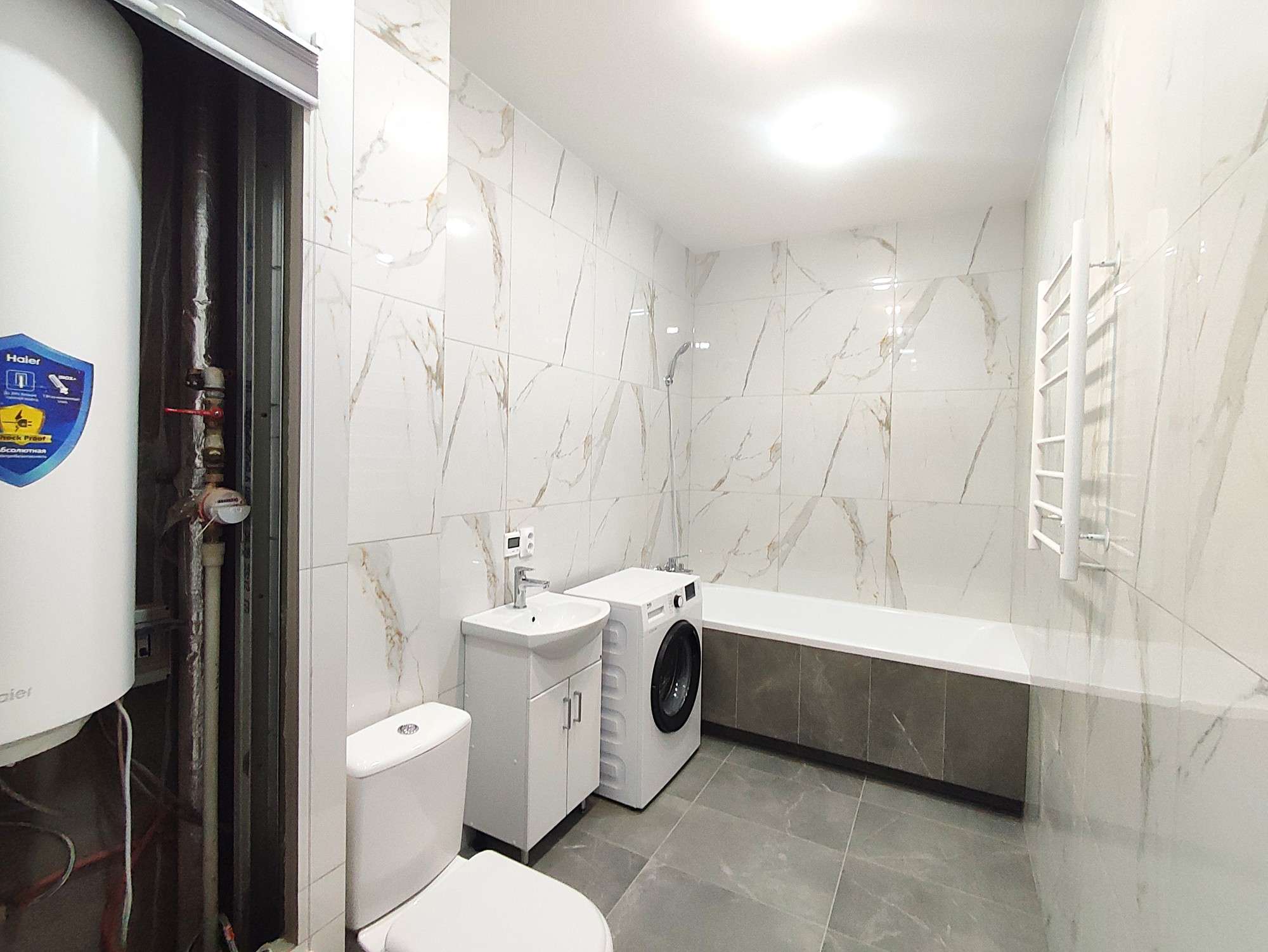 Санузел – объединенный 6,7 м2, с регулируемым подогревом пола, биде, стиральной машиной и бойлером на 50 литров.