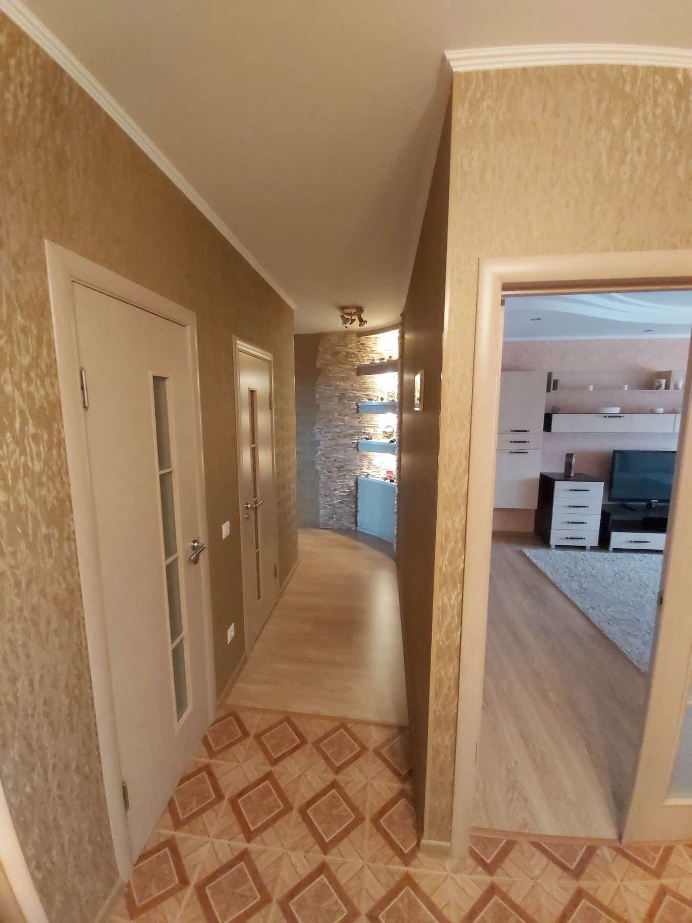 В квартире выполнен ремонт из высококачественных дорогих материалов в тёплых натуральных тонах: на полу ламинат, на кухне и в санузлах — керамическая плитка, стены отделаны декоративным камнем. Электрокамин добавляет не только душевного тепла. Утеплённая и застеклённая лоджия - дополнительное пространство для релакса.