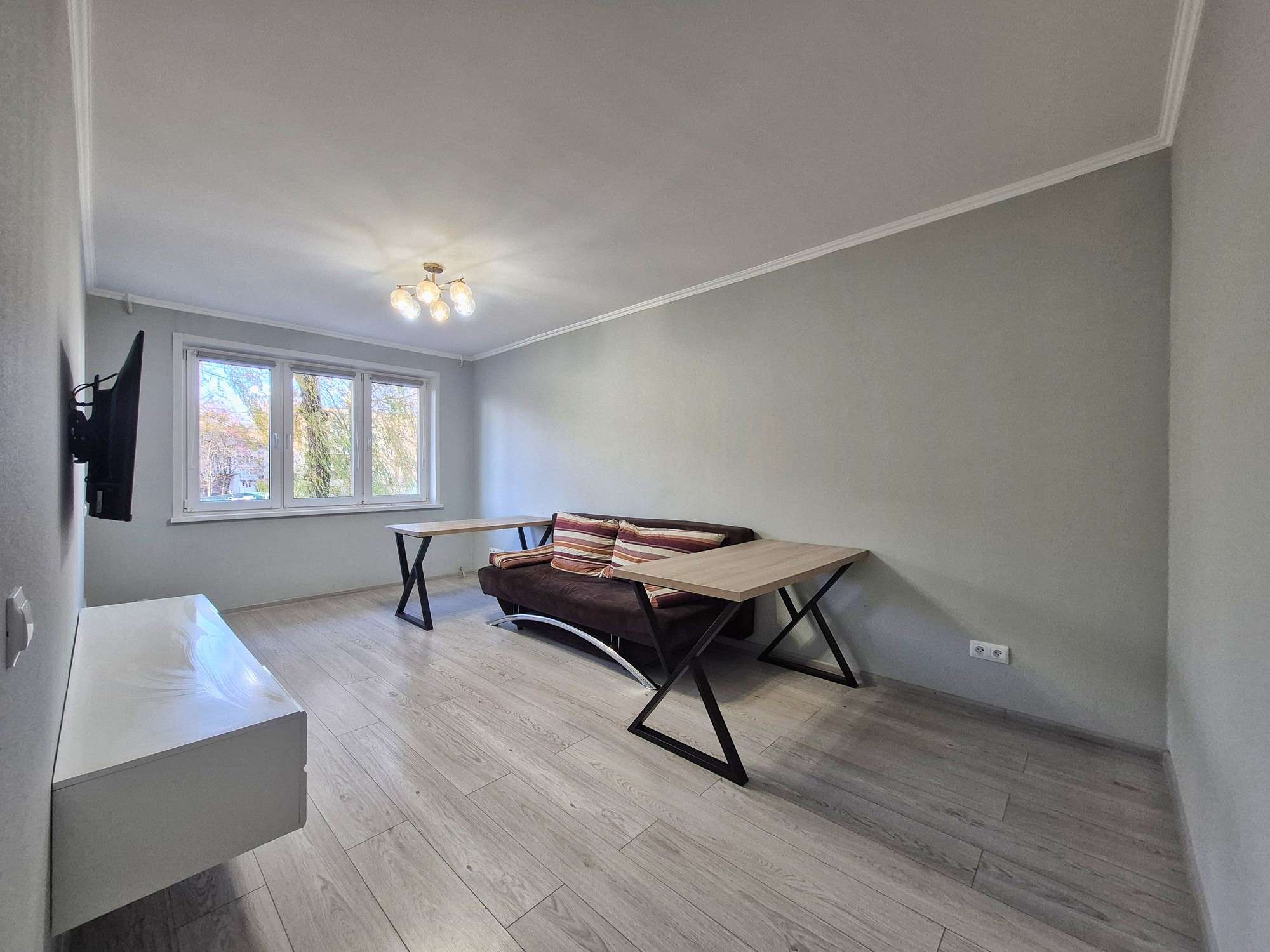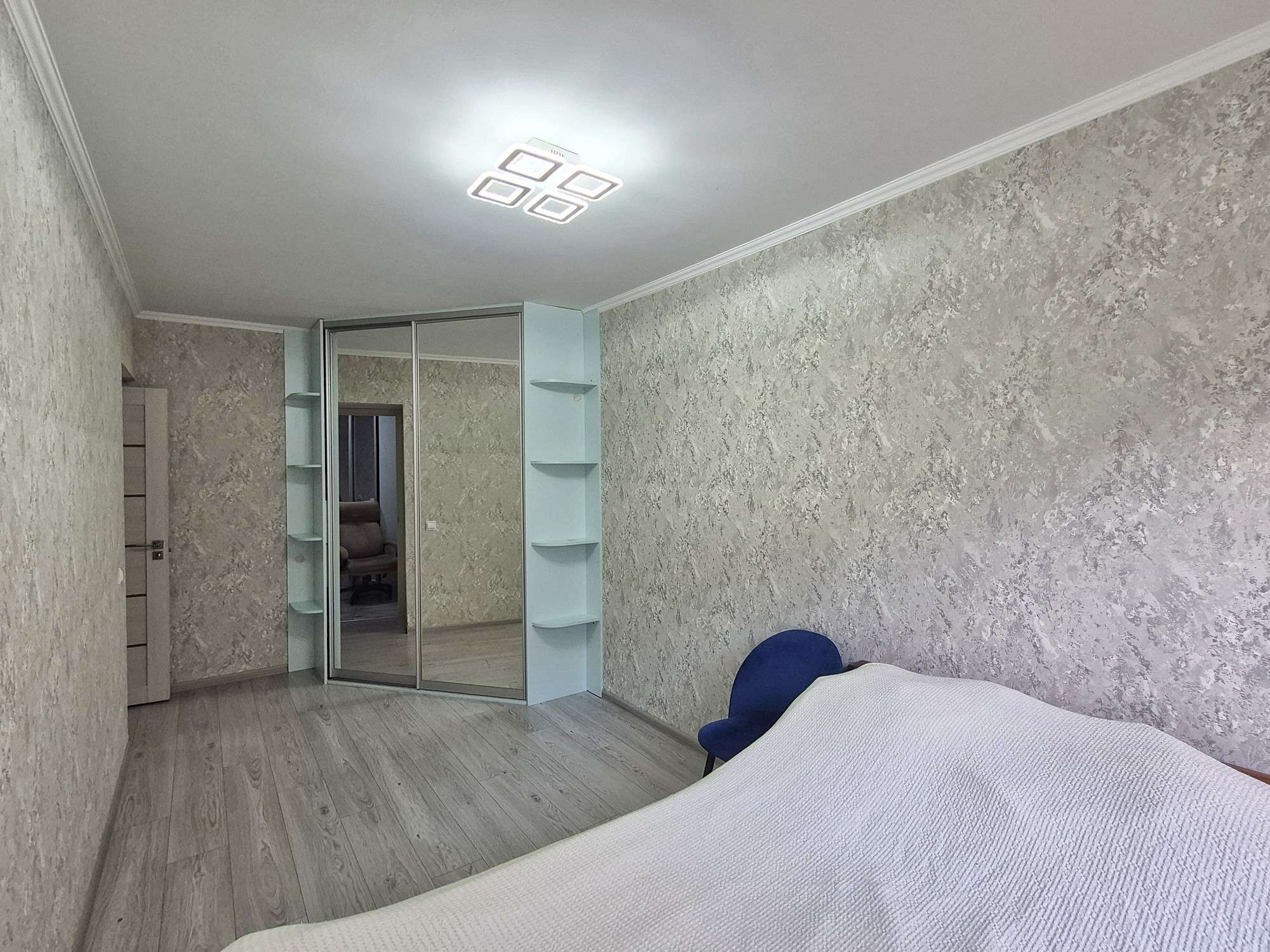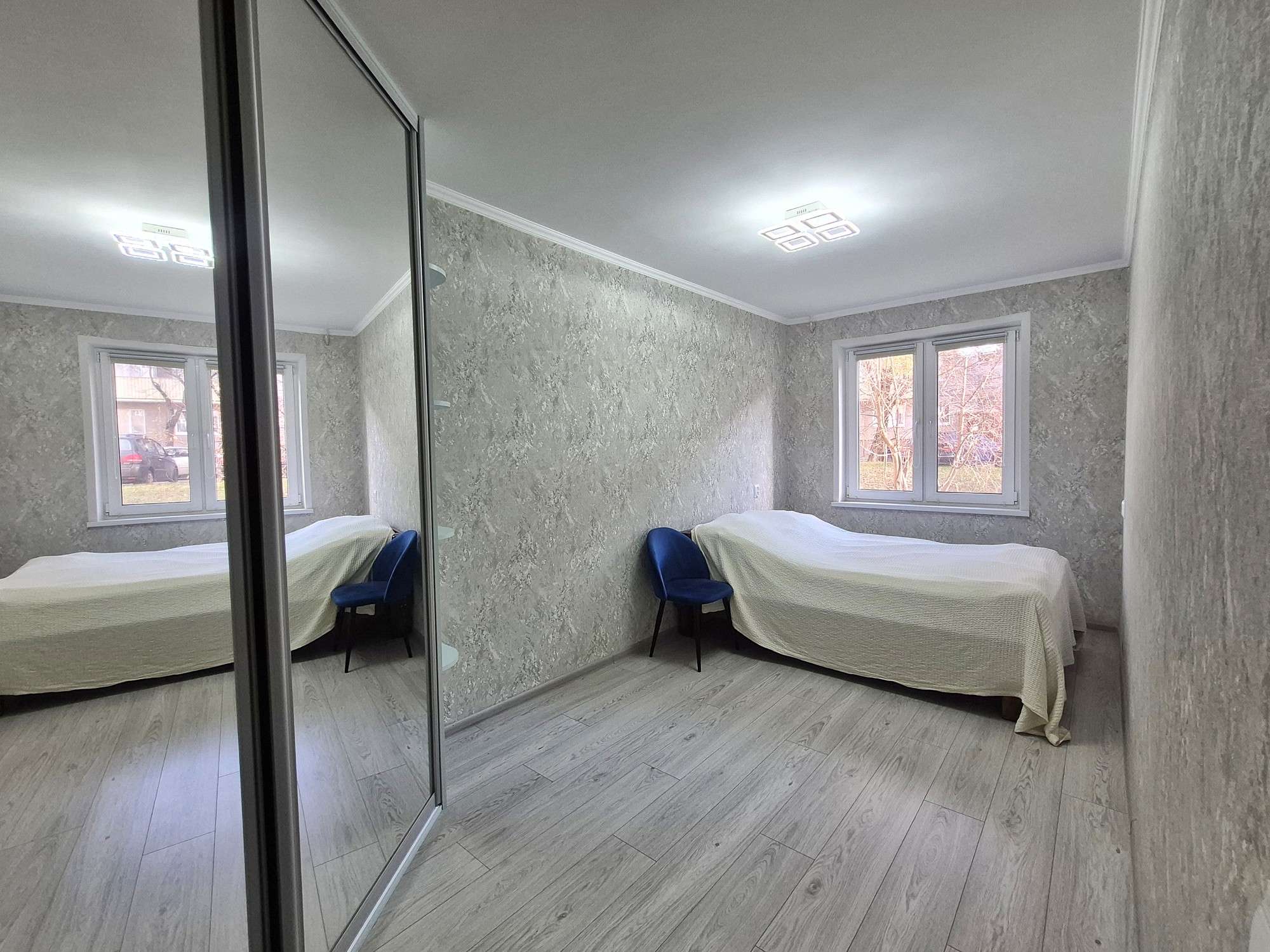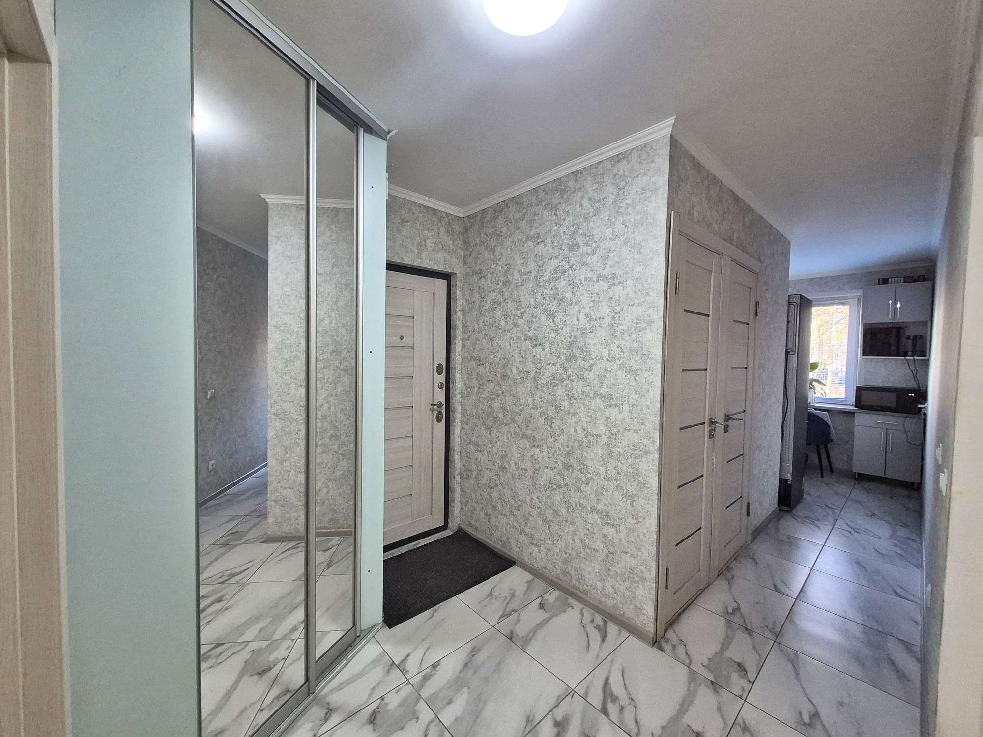 В квартире сделан новый ремонт. Полы выровнены - (залита стяжка) и утеплены пенополистеролем 5 см. Заменена электропроводка (медная) и сантехника. На полу в кухне и коридоре лежит плитка, в жилых комнатах - ламинат. Стены оклеены обоями. Потолки ровные покрашены.
