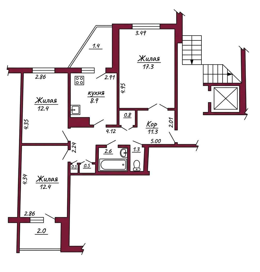 Общая площадь квартиры – 67,8м2; жилая – 42,1 м2; кухня – 8,9 м2; высота помещений – 2,60 м.