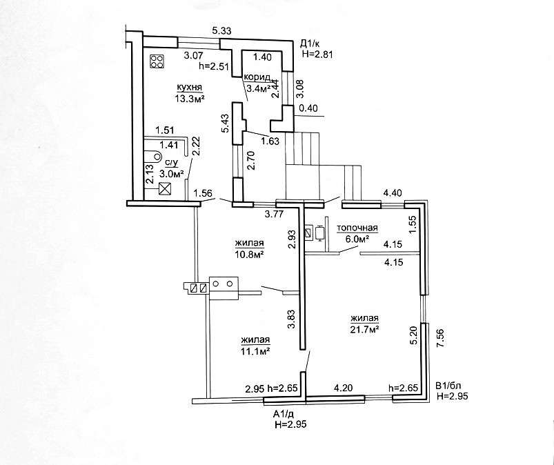 Планировка включает три жилые комнаты, кухню площадью 13,3 м², санузел/душевая (3 м²), топочную (6 м²) и коридор. Высота потолков — 2,65 м.