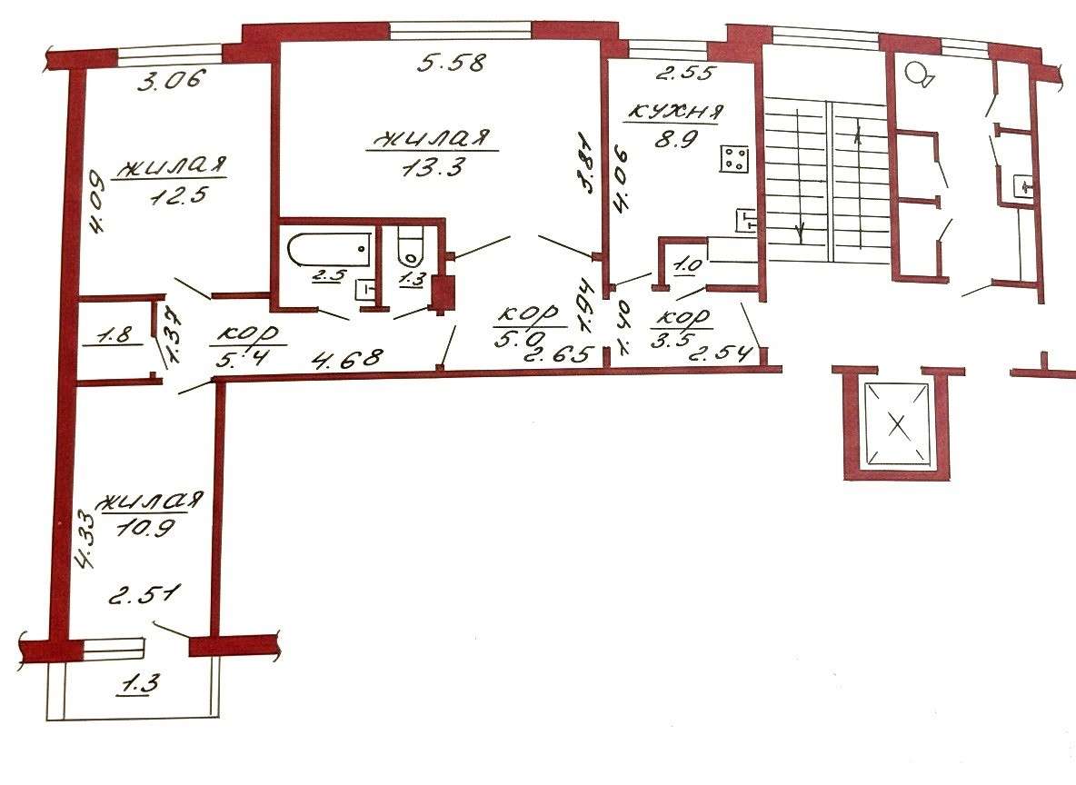 Планировка: три комнаты (две комнаты 12.5 и 10.9м2 — на разные стороны, одна большая - 19,3м2).