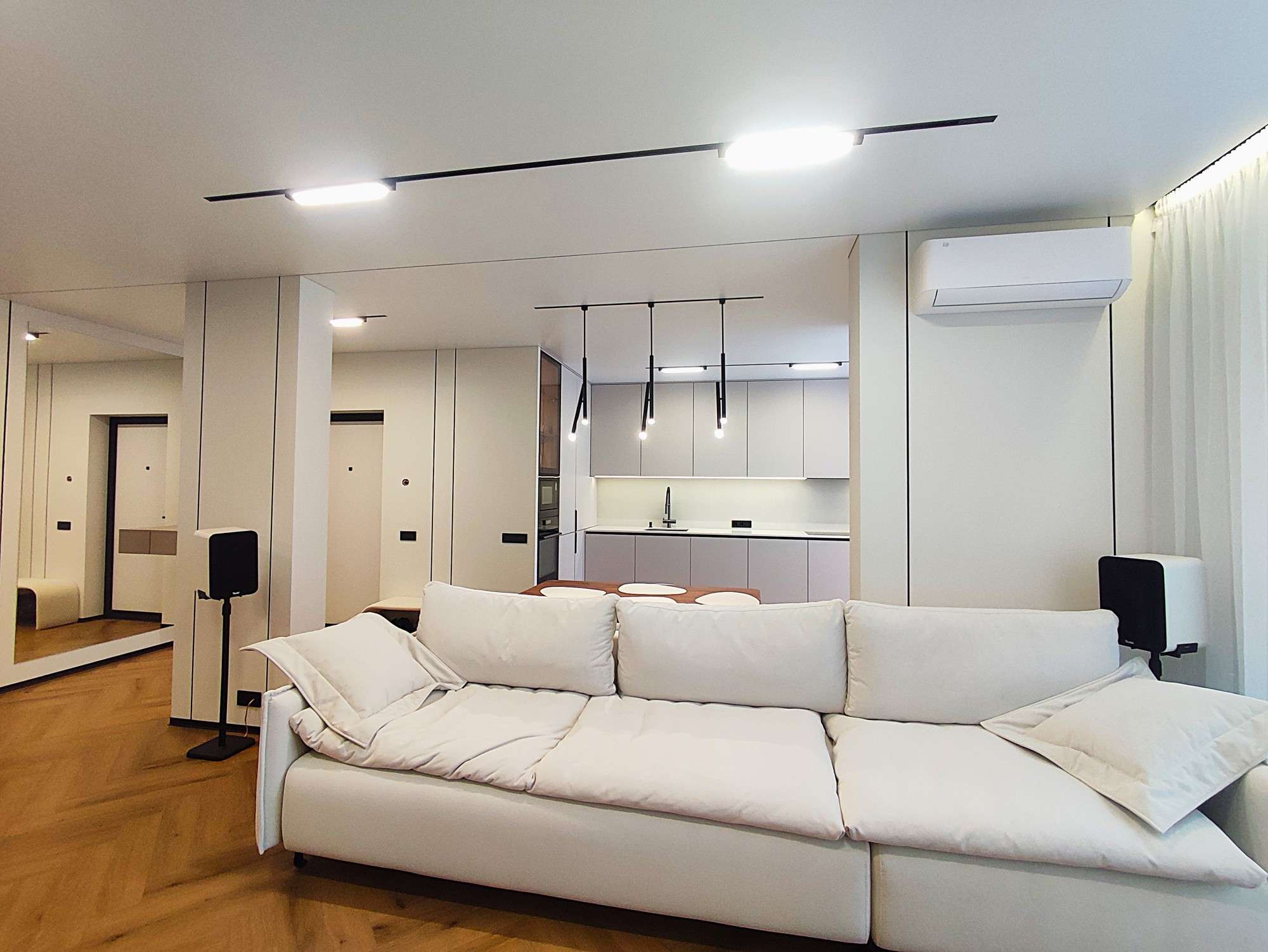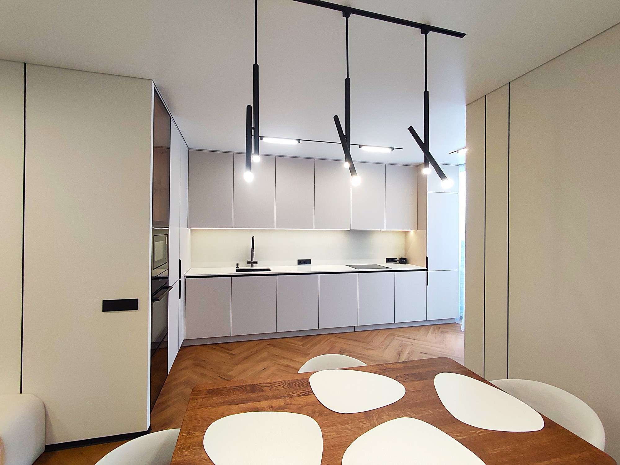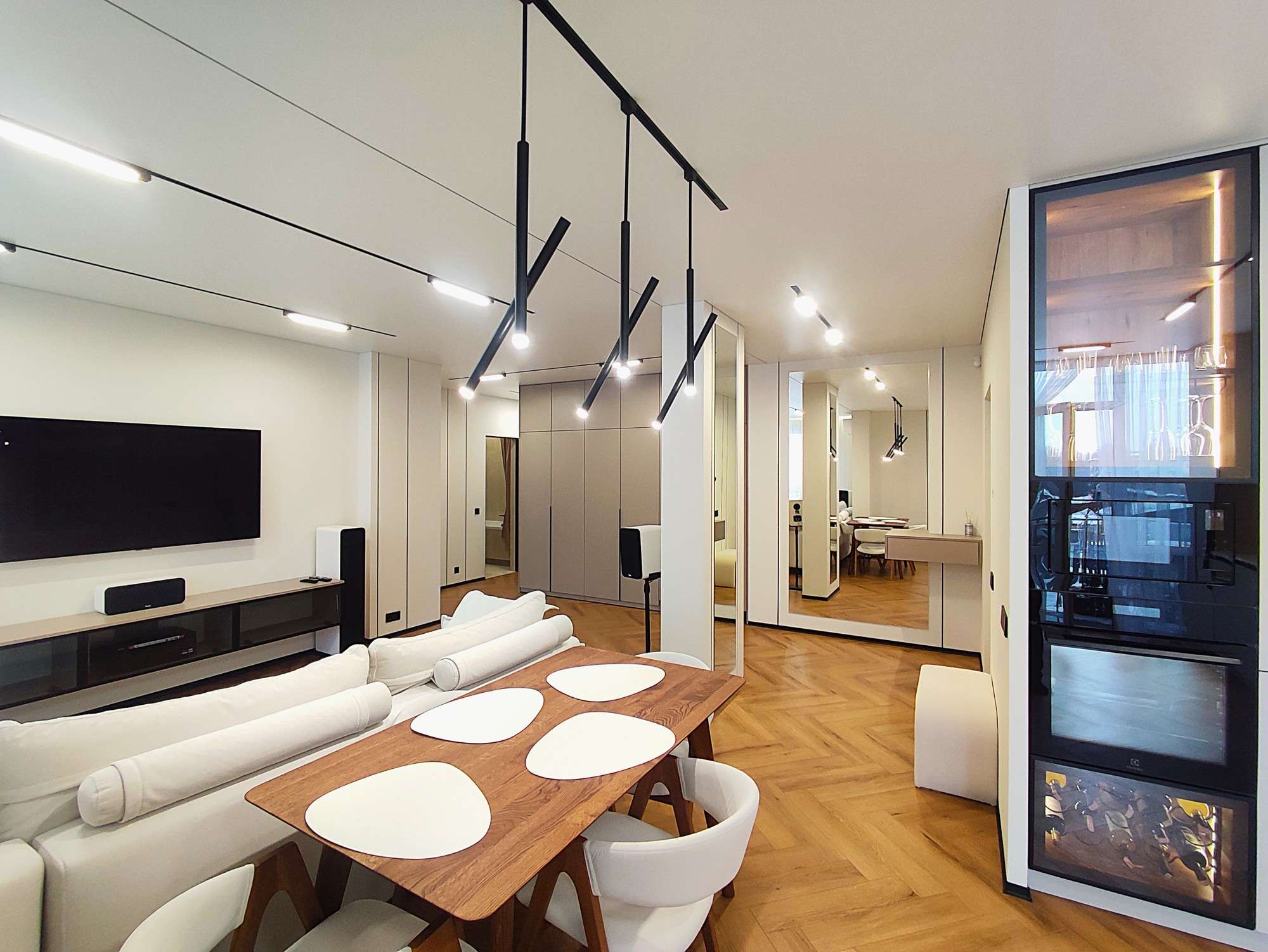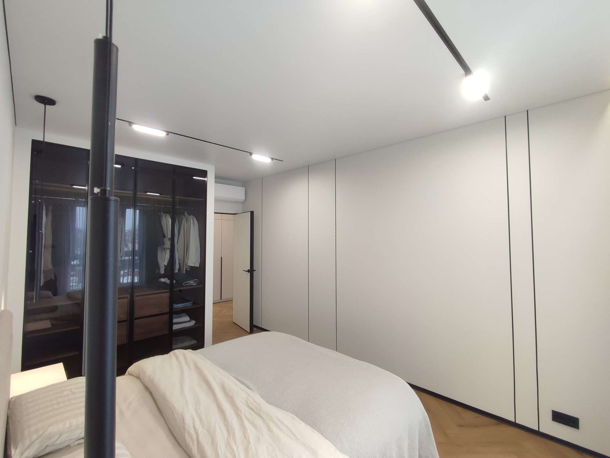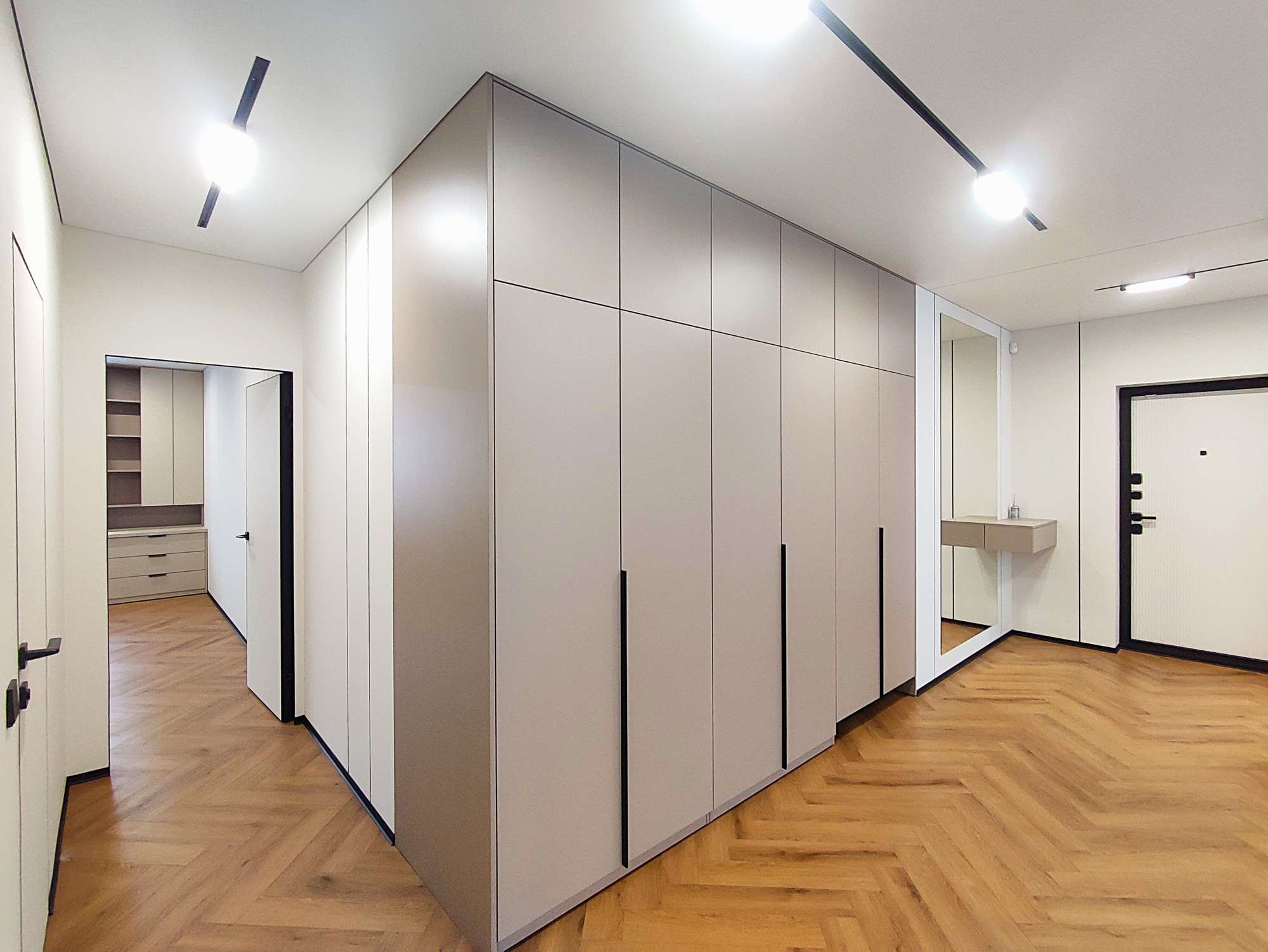 Электропроводка выполнялась с учётом норм и современных требований: выделена скрытая зона для размещения роутера, выведены Lan розетки во все комнаты, дополнительные пункты подсветки. Распределенное освещение по всей квартире исполнено трэковой системой, умная электрика (проходные выключатели, разные варианты освещения);