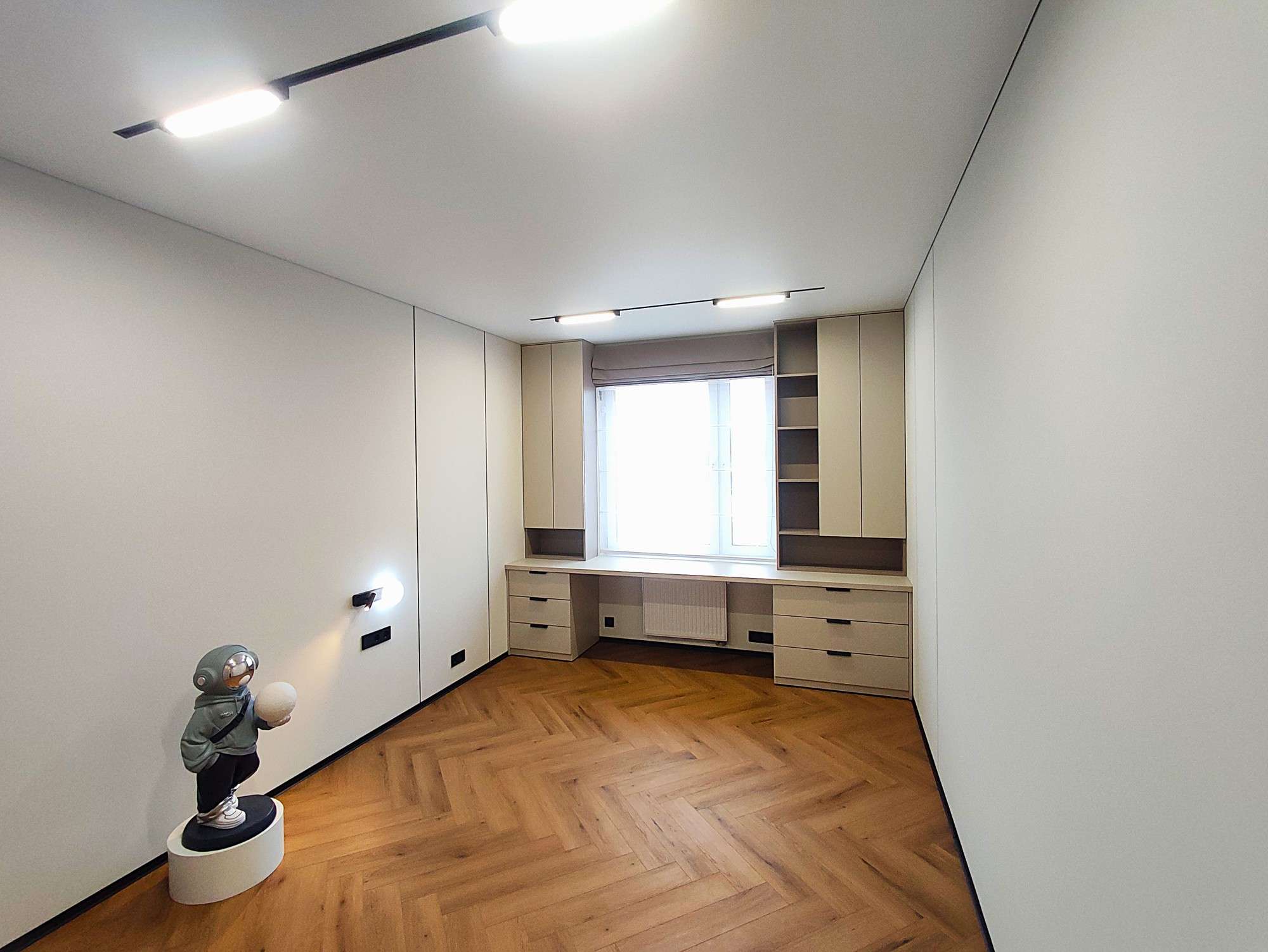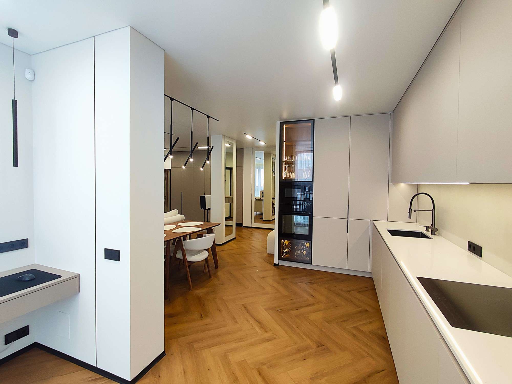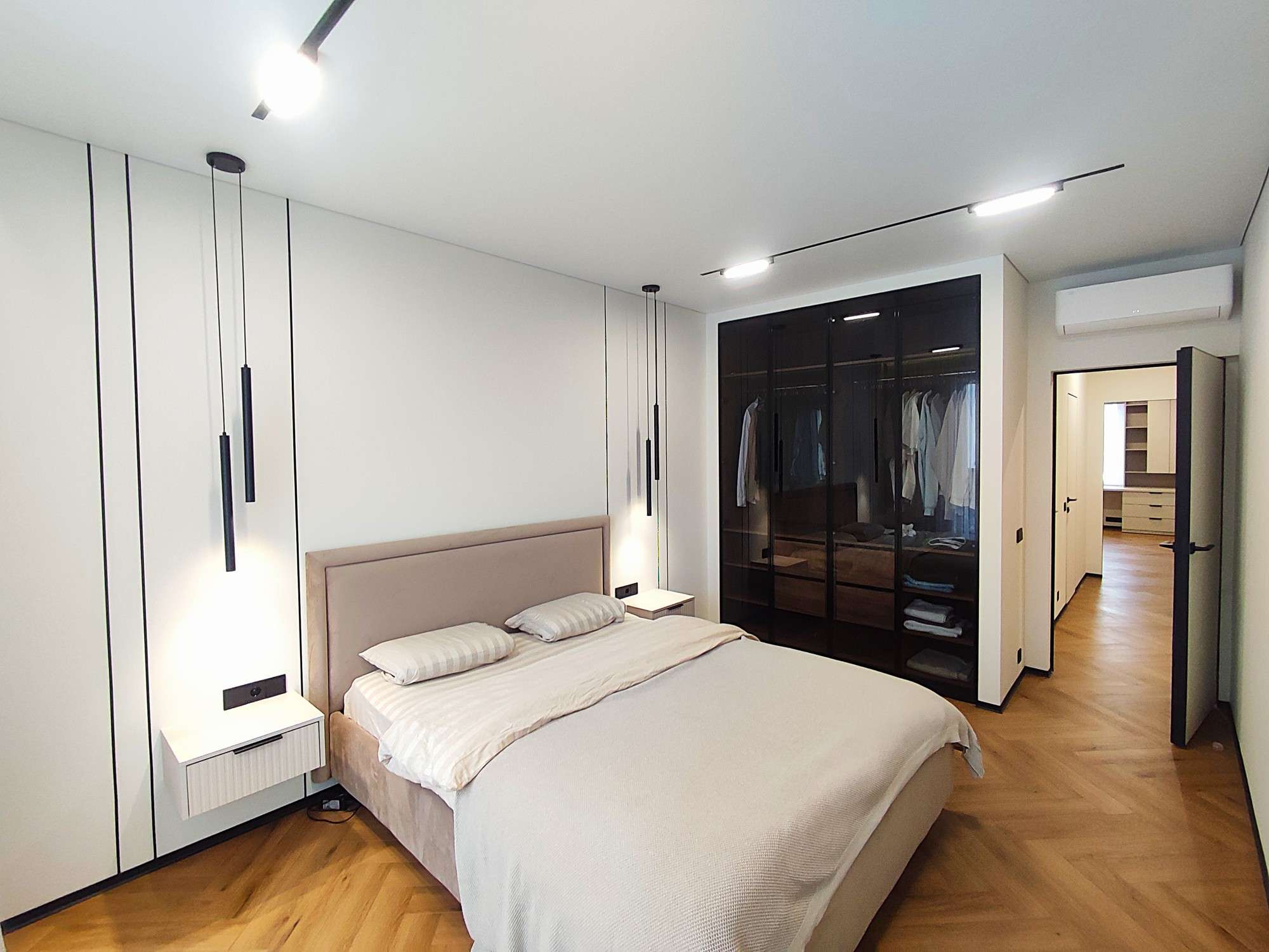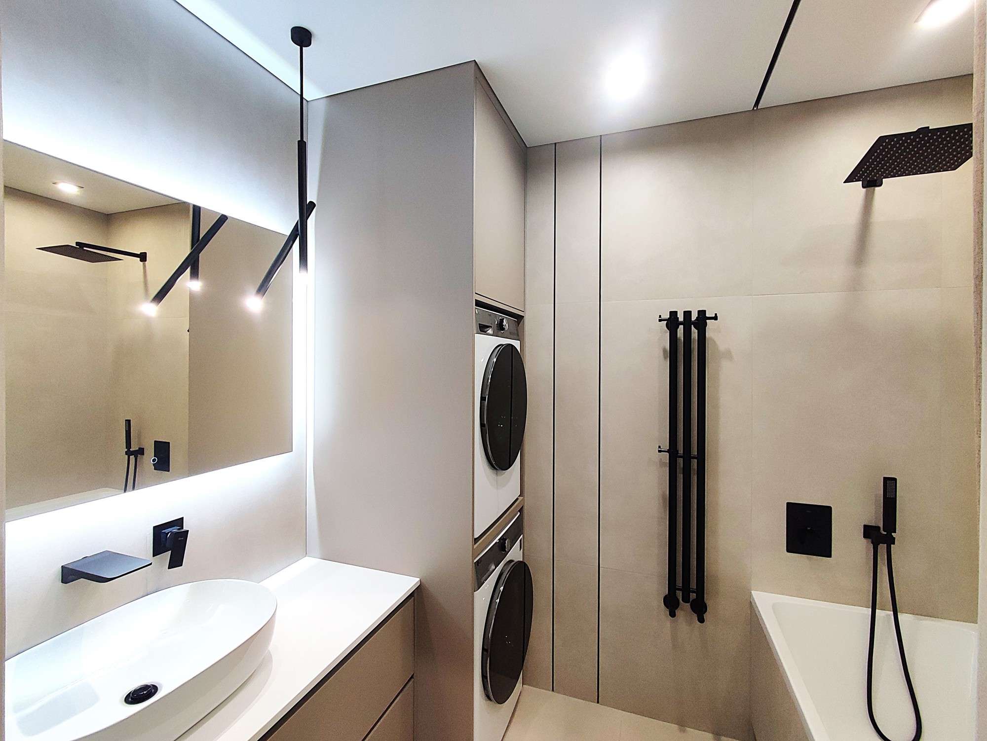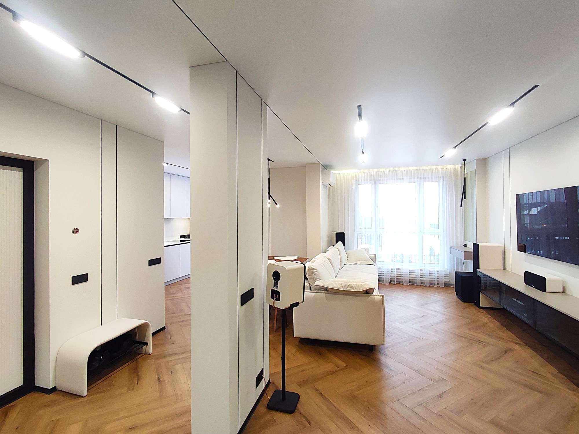Электропроводка выполнялась с учётом норм и современных требований: выделена скрытая зона для размещения роутера, выведены Lan розетки во все комнаты, дополнительные пункты подсветки. Распределенное освещение по всей квартире исполнено трэковой системой, умная электрика (проходные выключатели, разные варианты освещения);