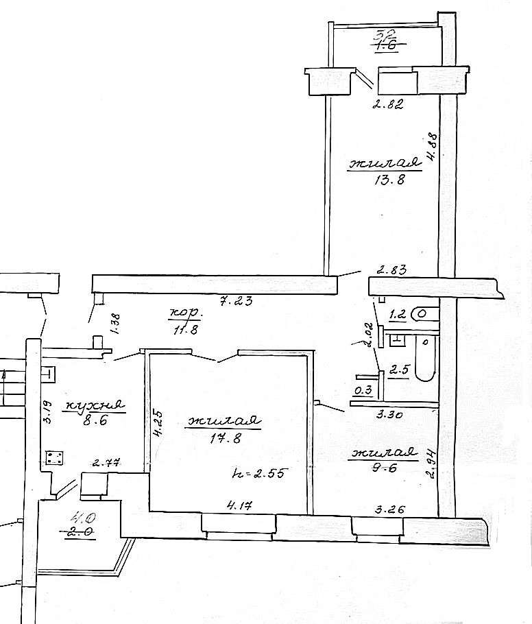 Площадь общая 72.8 ,жилая 41.2 (комнаты 17.8,13.8 м2,9.6 м2) кухня 8.6 м2 с выходом на лоджию.