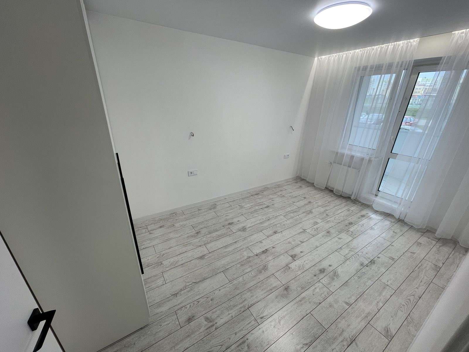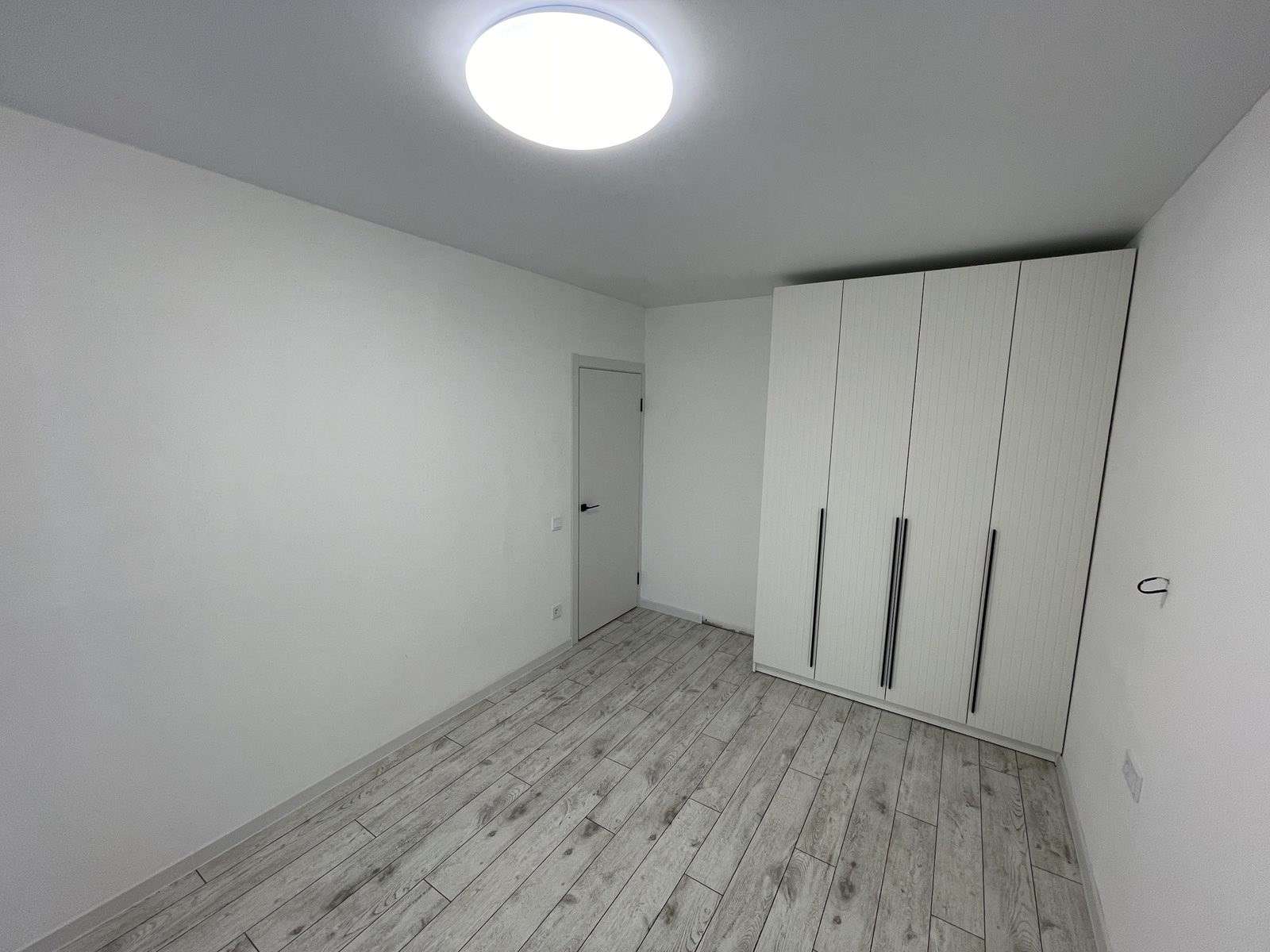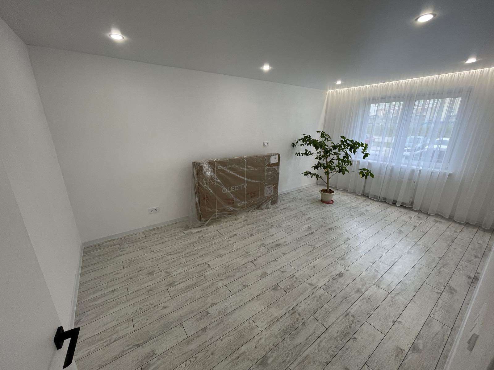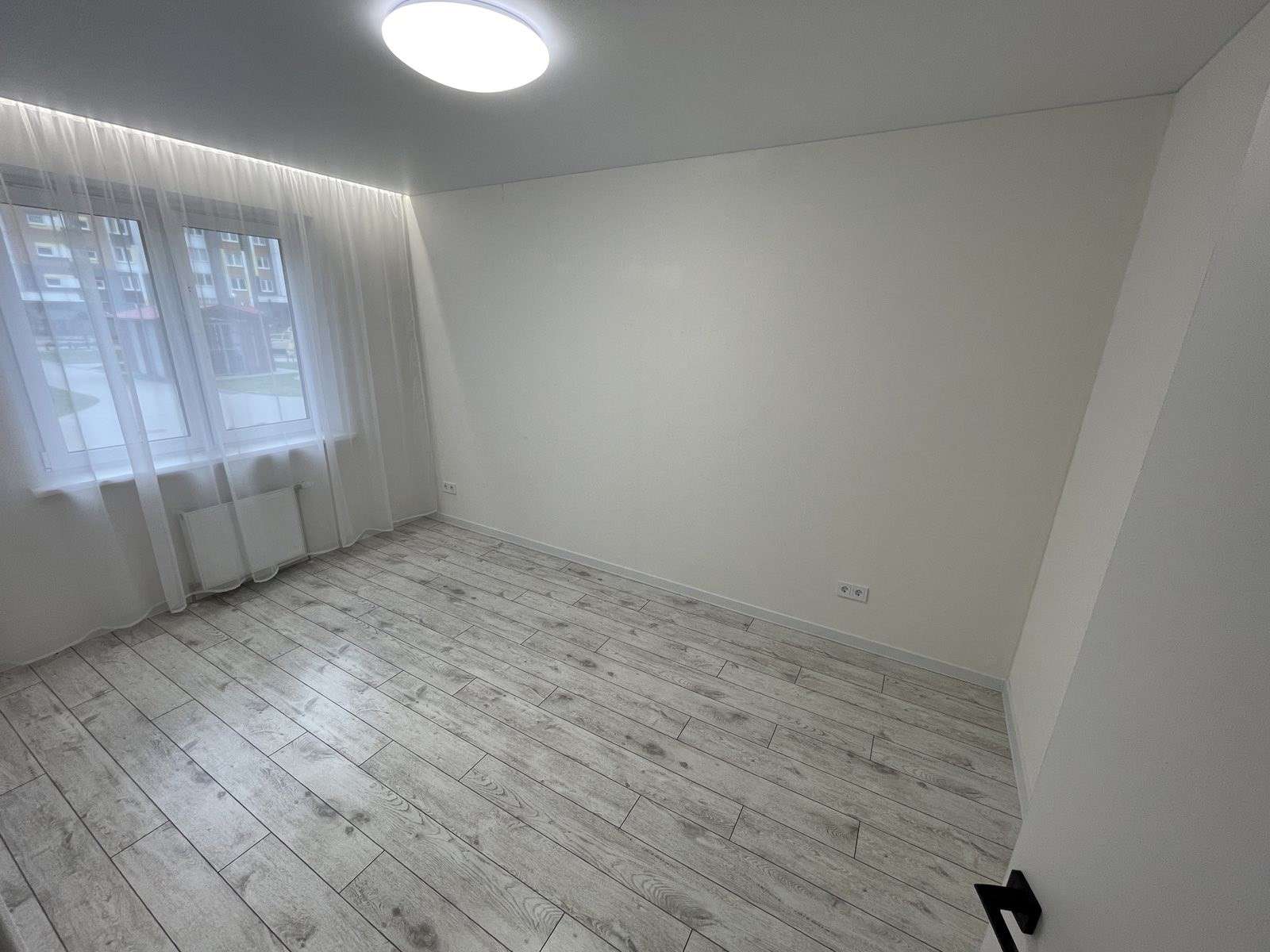Натяжной потолок,стены оклеены обоями, на полу ламинат.