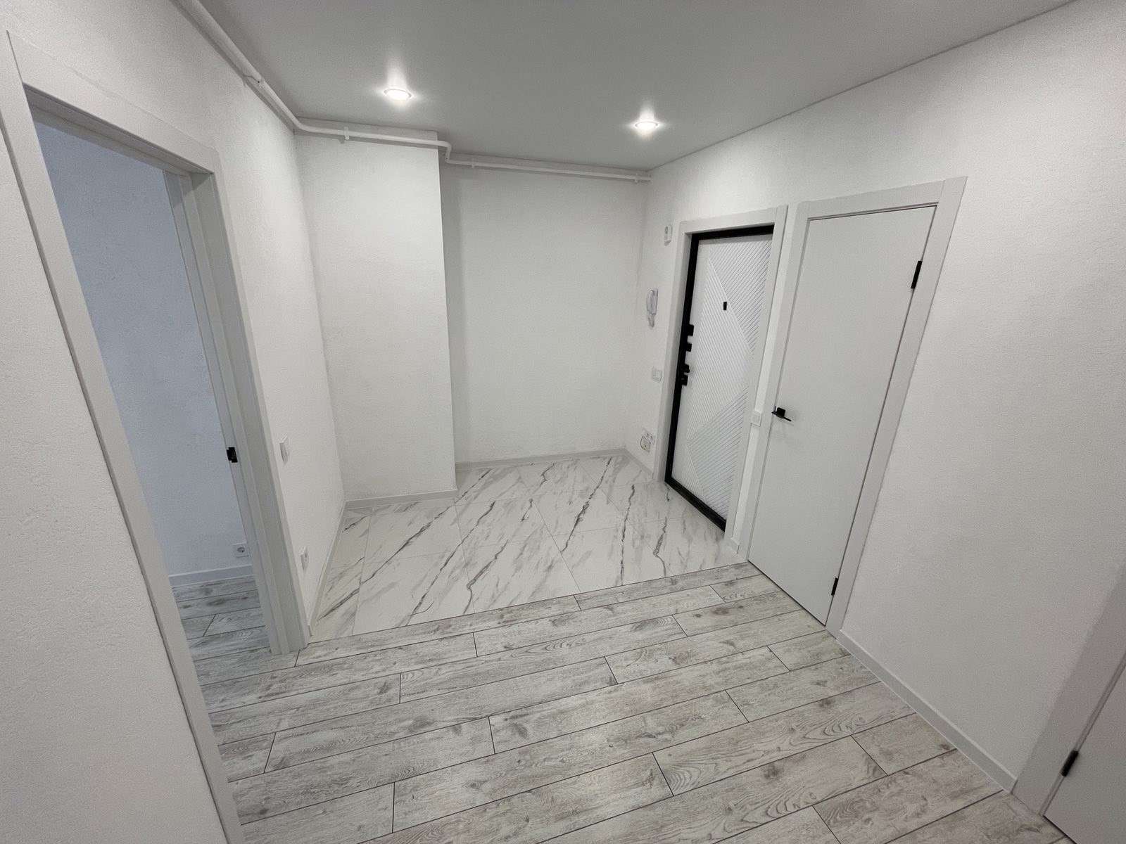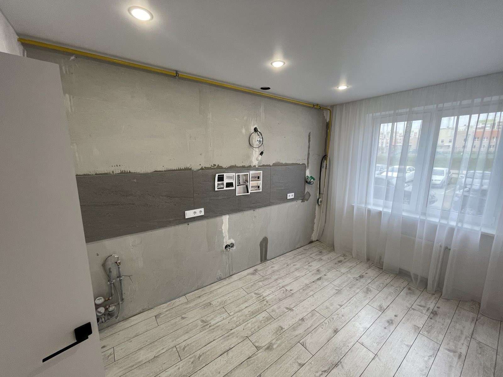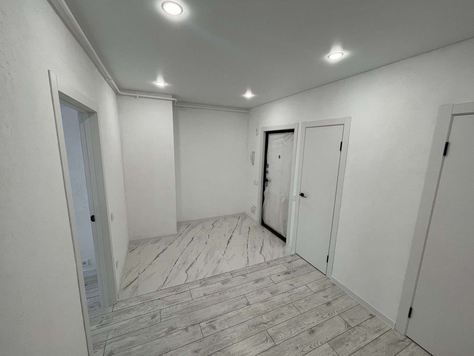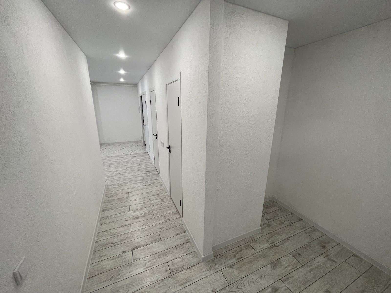 Натяжной потолок,стены оклеены обоями, на полу ламинат.