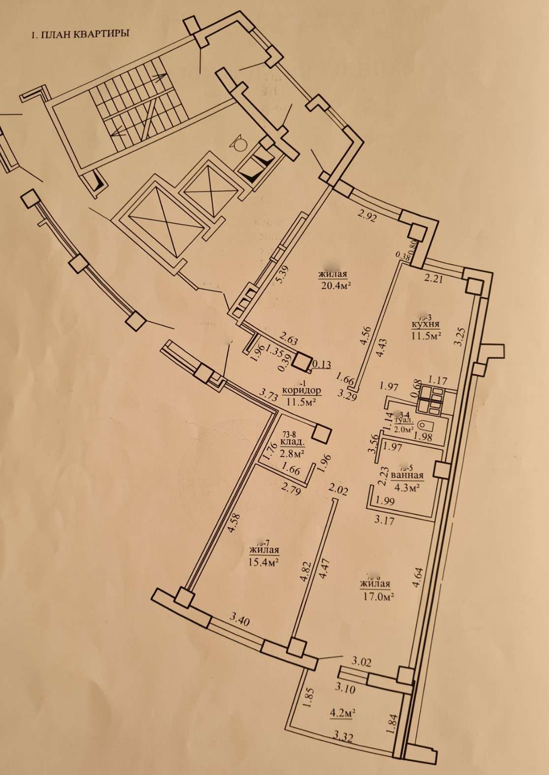 Просторная кухня 11.5 м2, зал 20.4 м2 большие комнаты 17.0 м2, 15.4 м2 . Лоджия 4.2 м2.