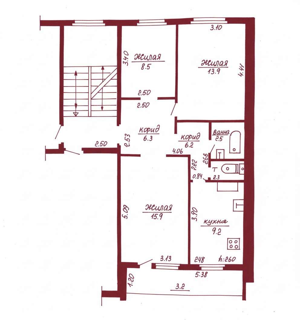 Общая площадь 64 м.кв.,жилая 38,3 м.кв. Просторная кухня 9.2 м.кв. Высота потолка 2.60м. С/у раздельный.