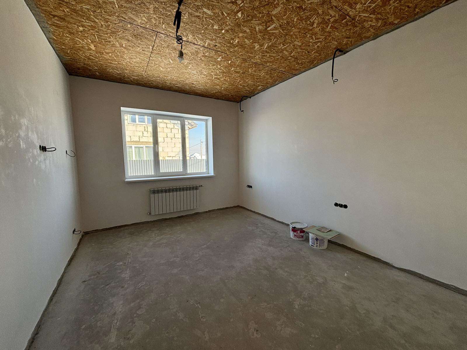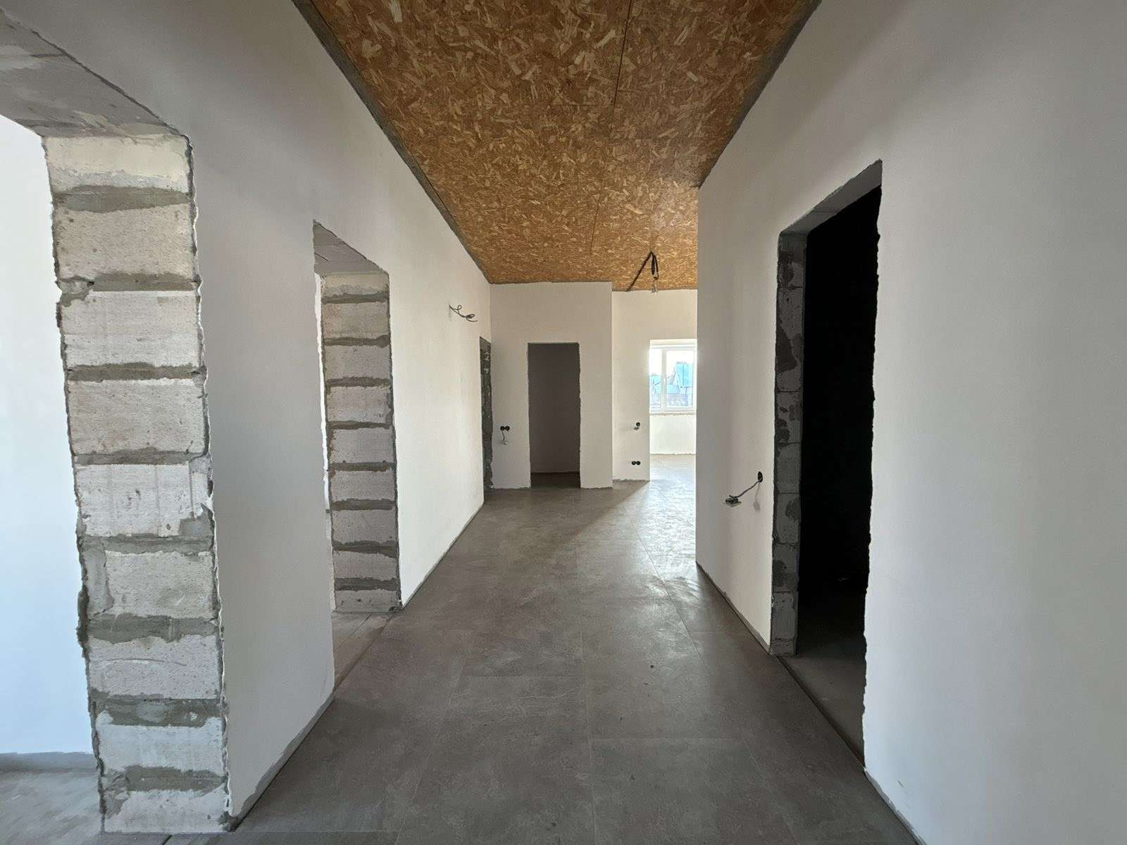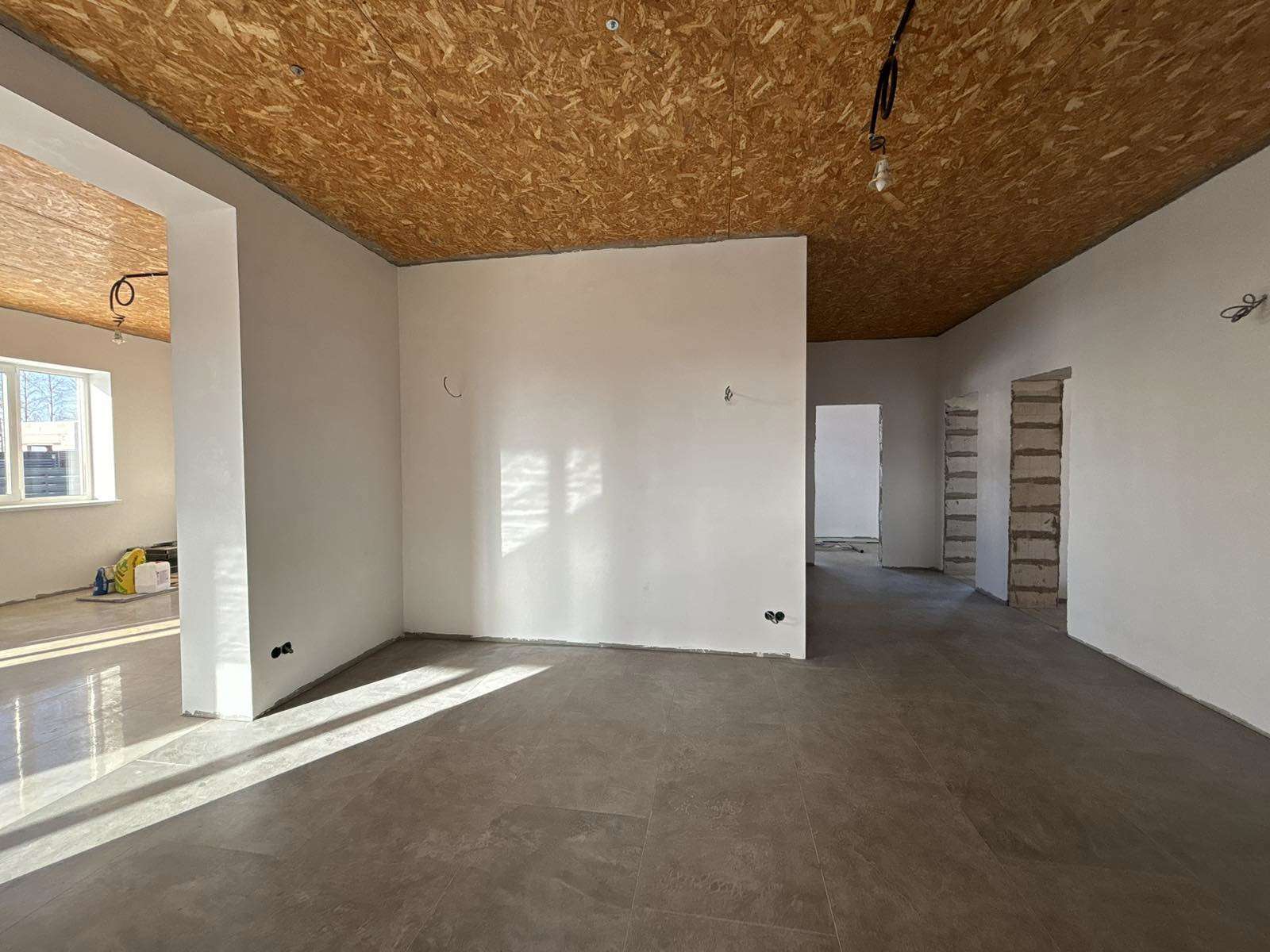 Стены поштукатурены и подготовлены под покраску . Лежит теплый пол ( везде , кроме жилых комнат). В спальнях – итальянские радиаторы. В доме 3 жилых комнаты , гостиная совмещенная с кухней и выходом на террасу ,большой хол, два санузла. Есть 2 террасы : с лицевой стороны и за домом .