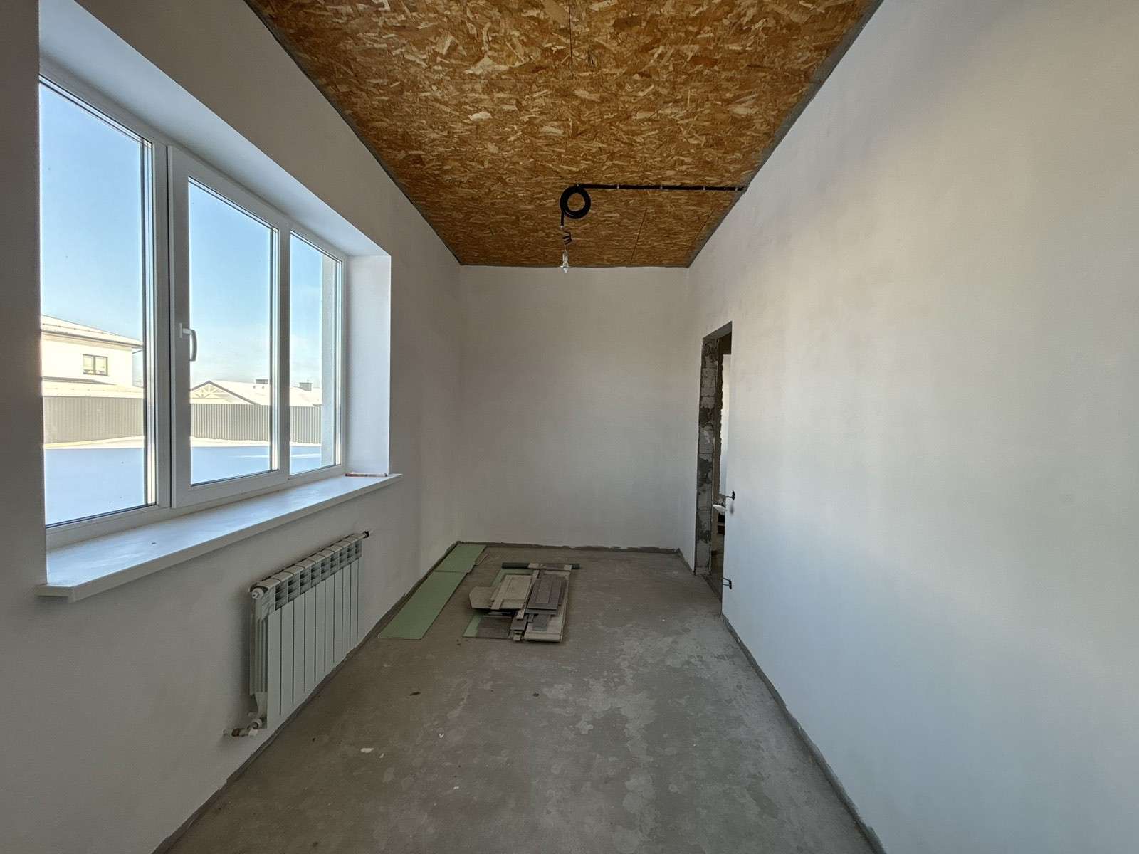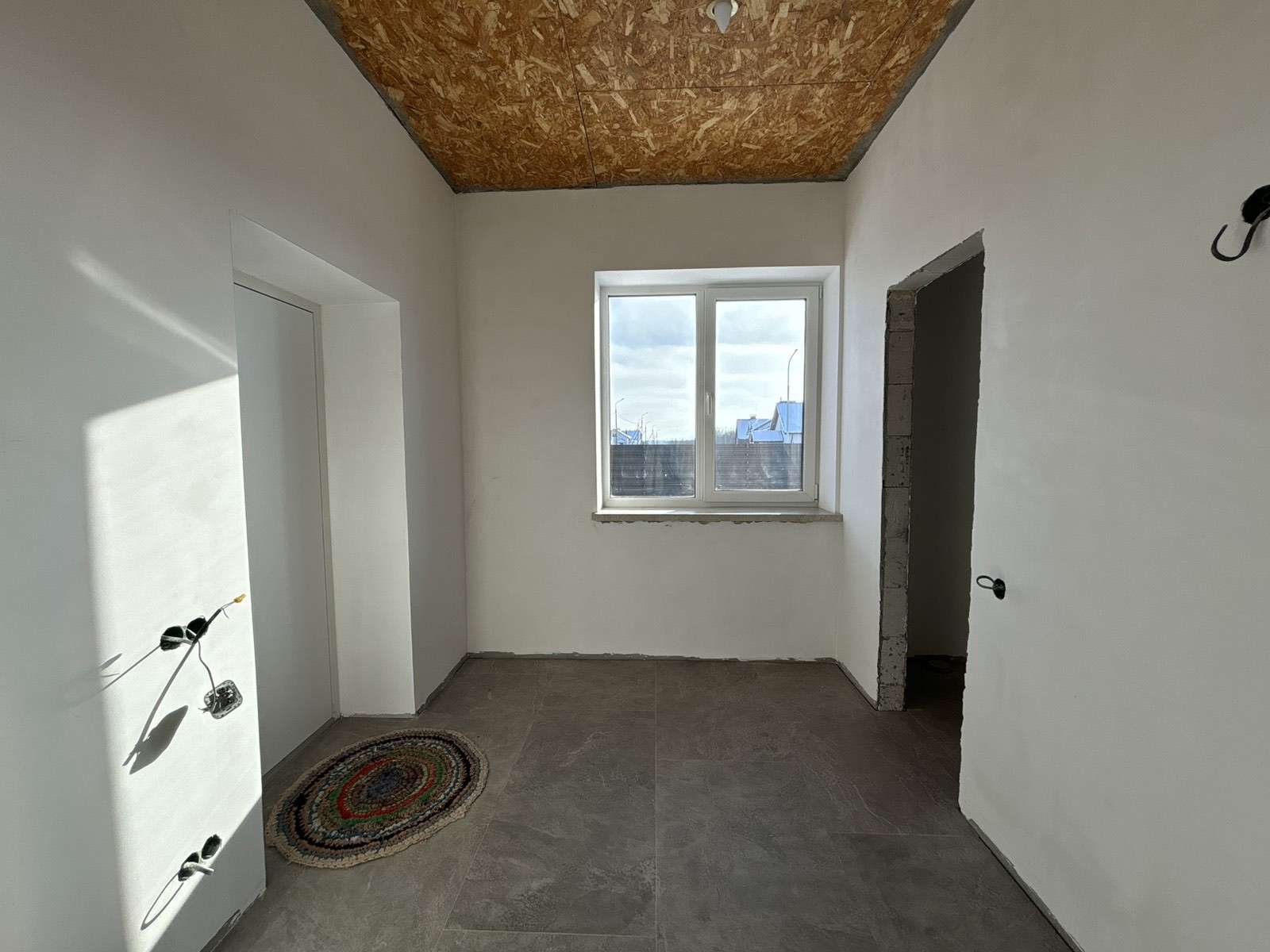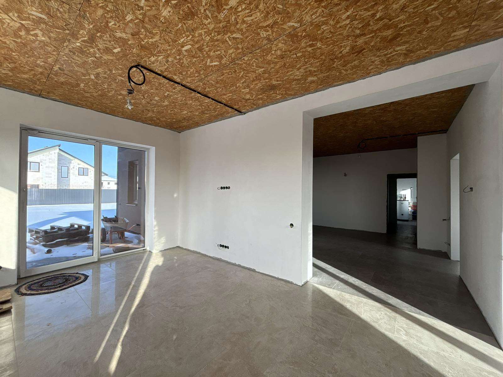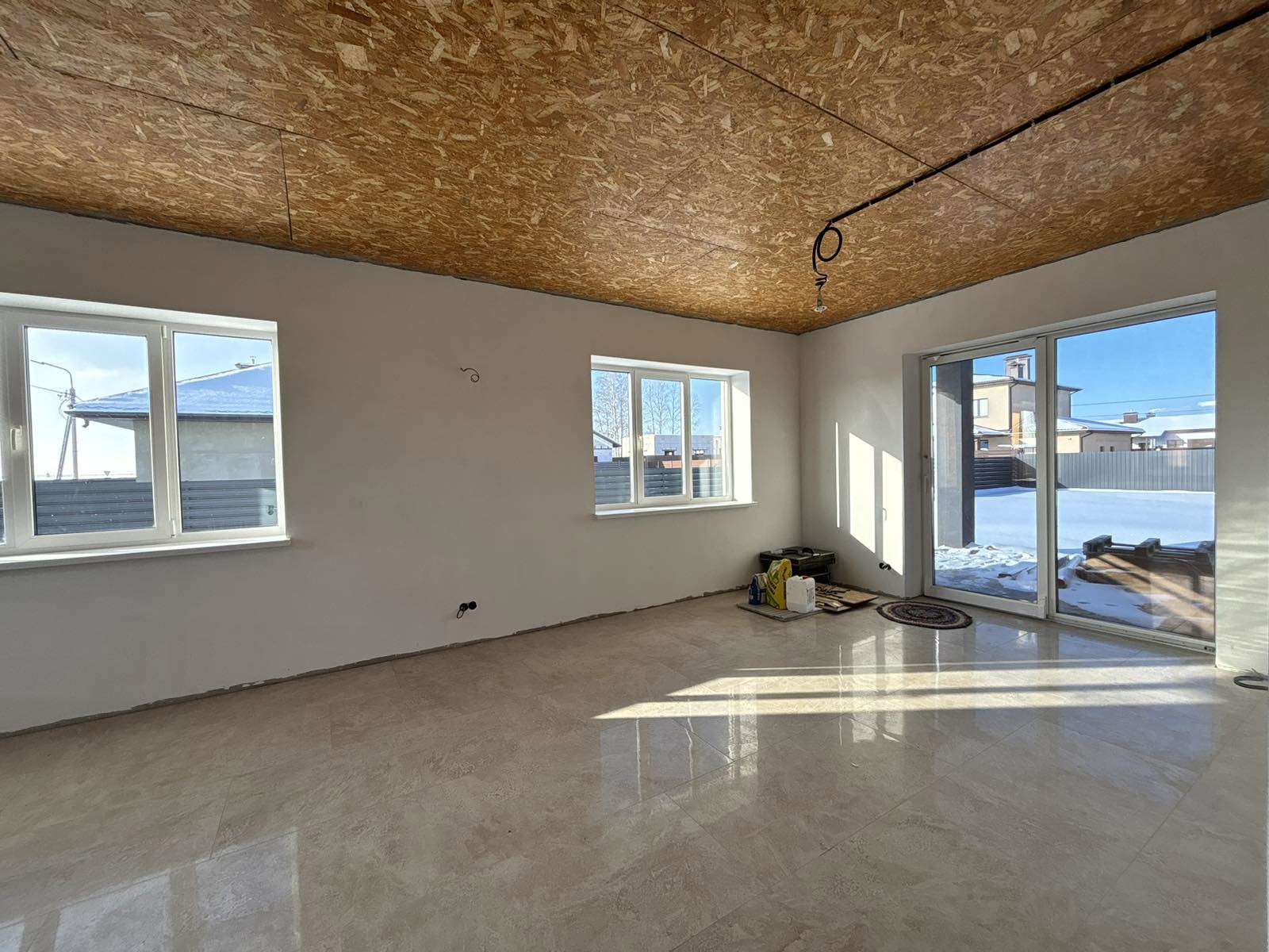Стены поштукатурены и подготовлены под покраску . Лежит теплый пол ( везде , кроме жилых комнат). В спальнях – итальянские радиаторы. В доме 3 жилых комнаты , гостиная совмещенная с кухней и выходом на террасу ,большой хол, два санузла. Есть 2 террасы : с лицевой стороны и за домом .