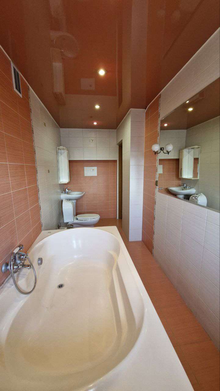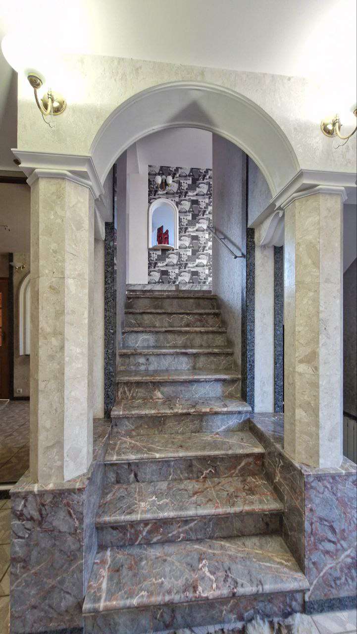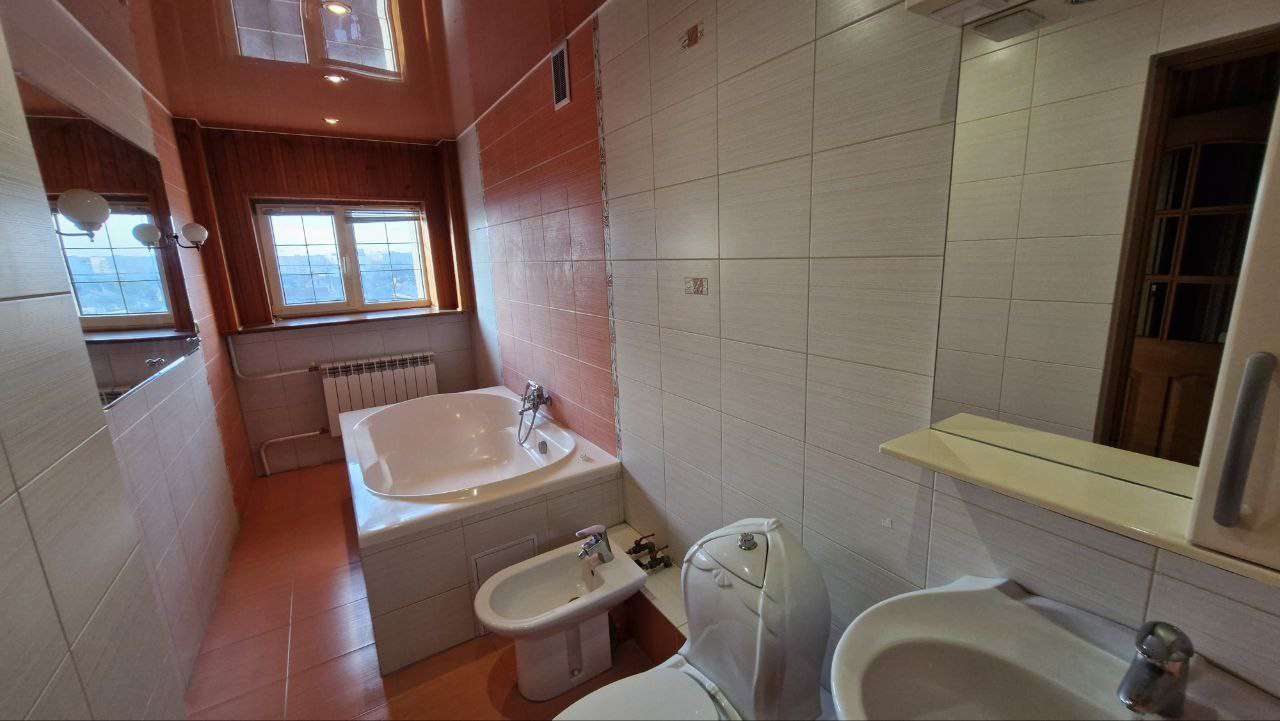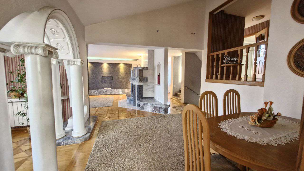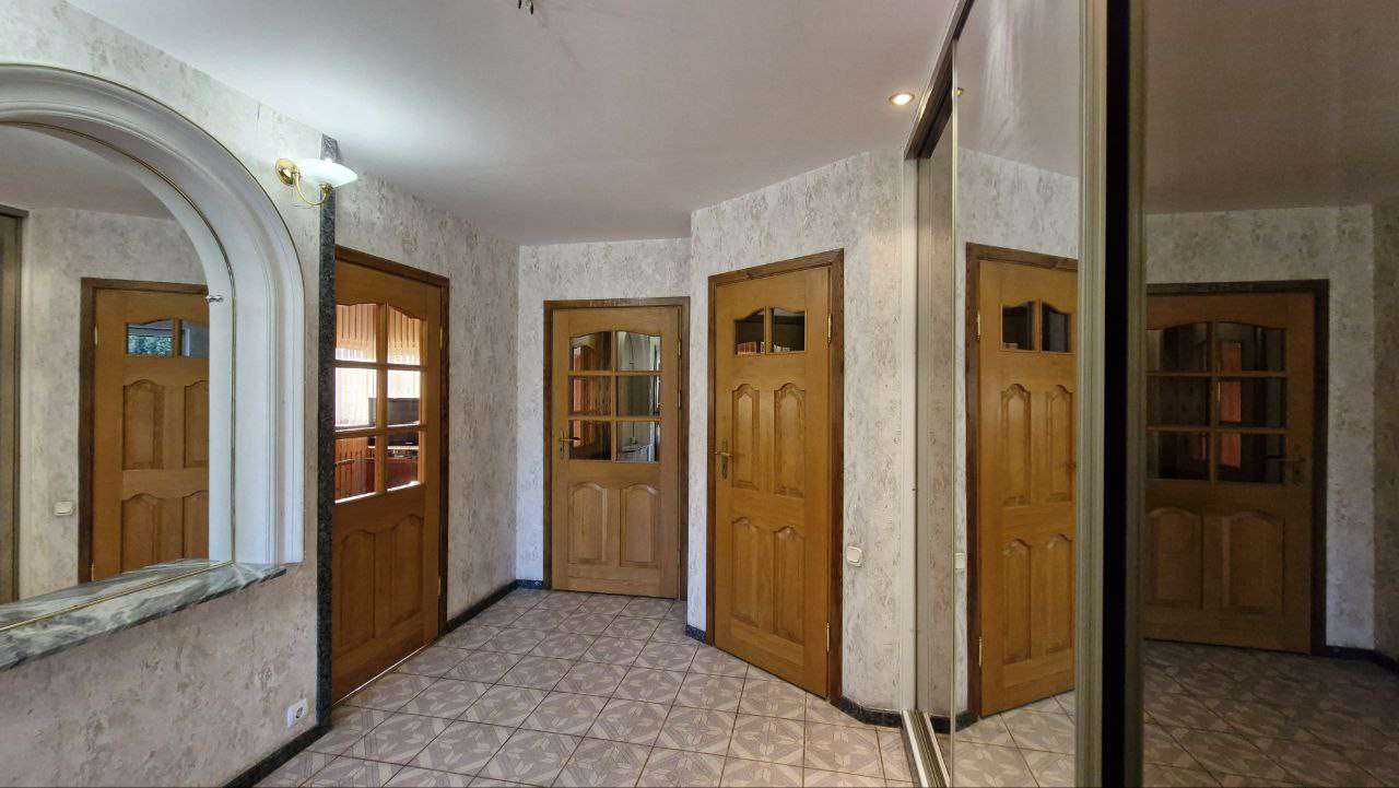 В доме имеется баня, бильярдная, гараж в подвальном помещении, три санузла, два камина, природный газ, центральная канализация, водопровод. Крыша - металлочерепица, пластиковые стеклопакеты. Участок 6,94 соток облагорожен и огорожен забором, практически прямоугольный. Земля в пожизненно наследуемом владении. Высажены туи, сосны, плодовые деревья. Двор выложен тротуарной плиткой. На участке организована зона барбекю, установлен фонтан, бассейн и беседка.