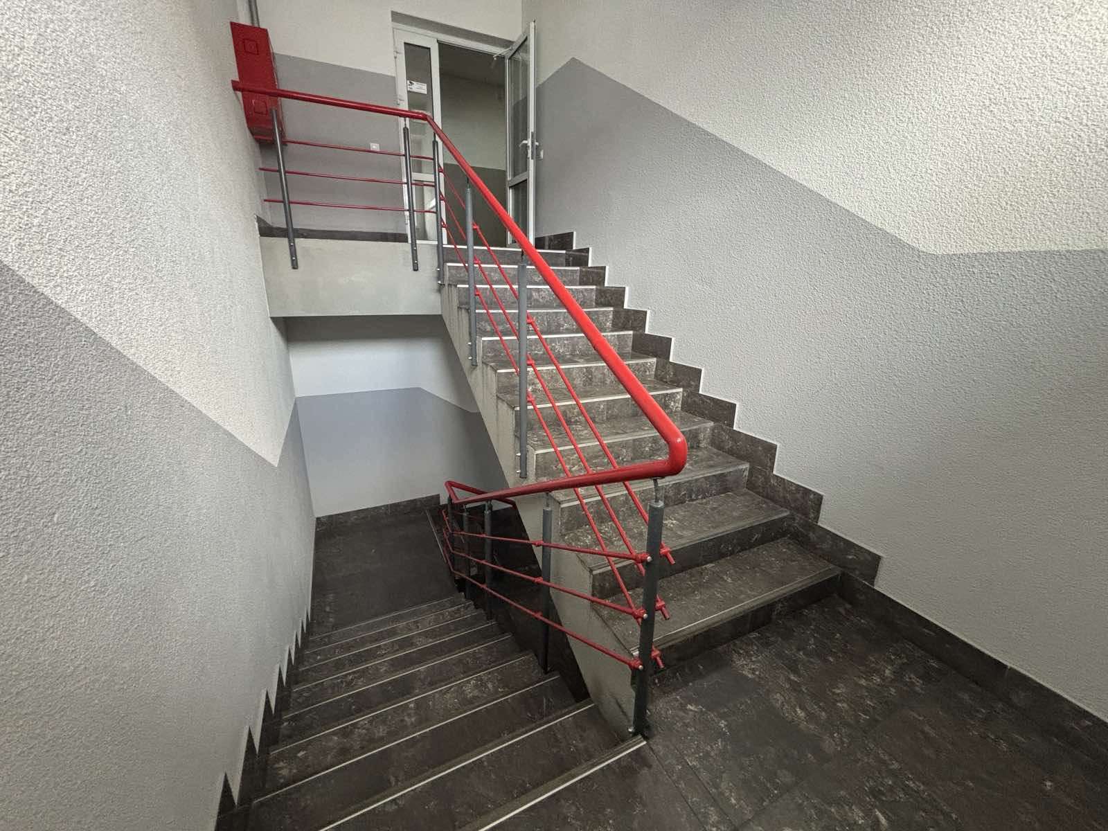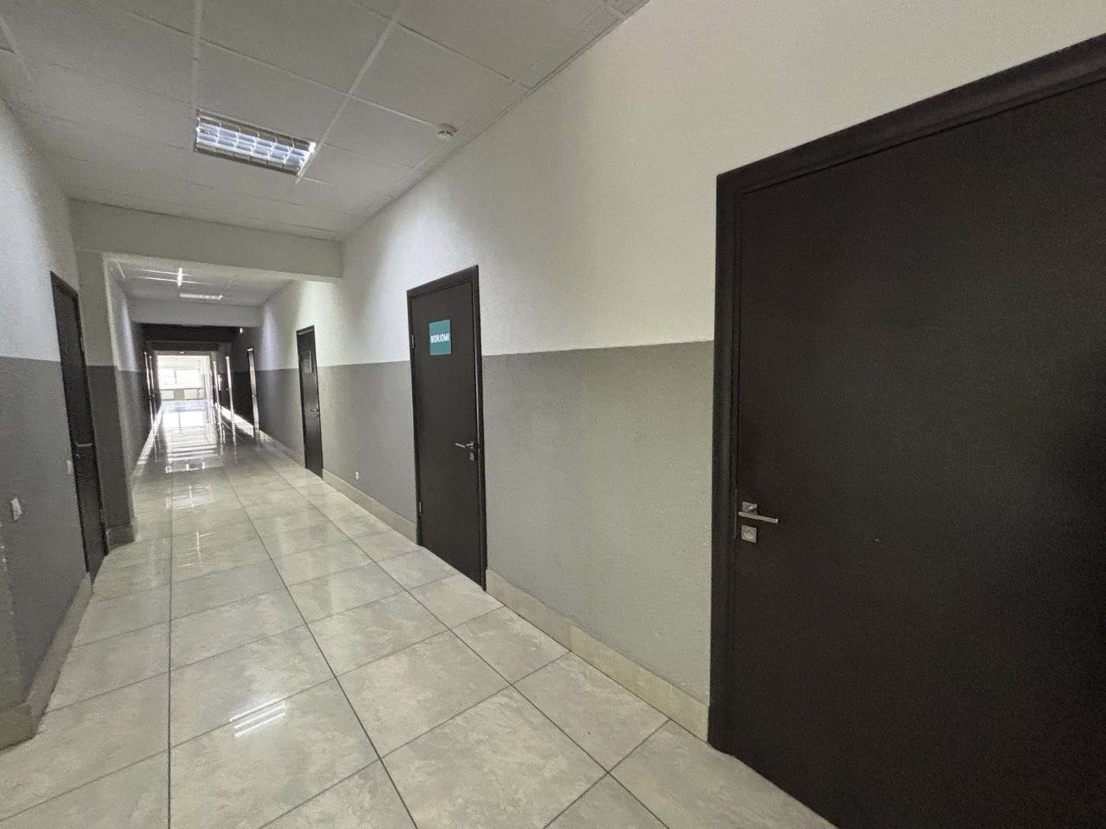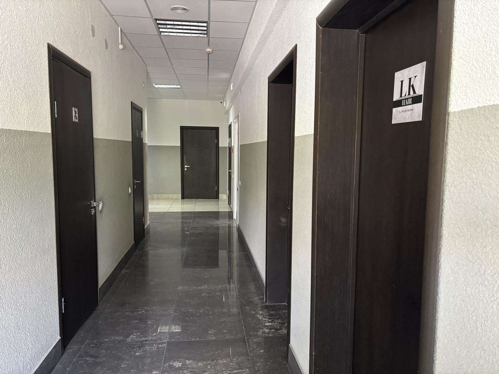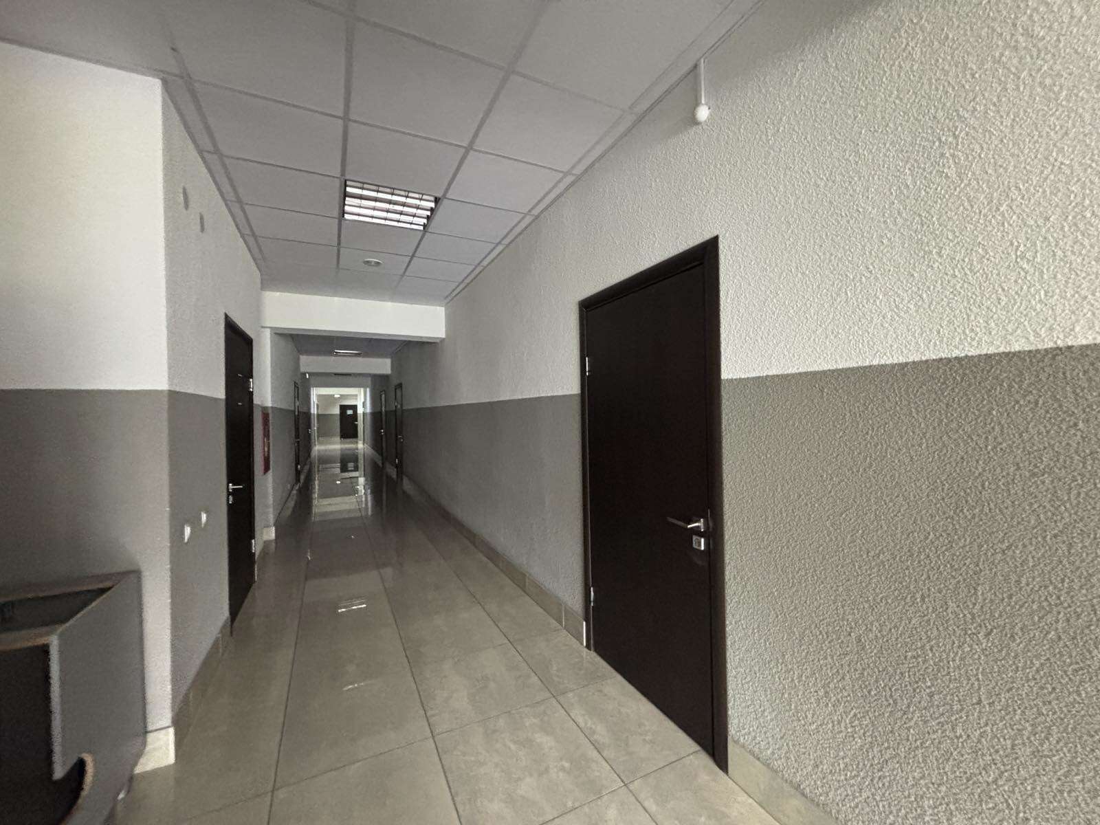 Офисная свежая отделка. Большая парковка у здания.